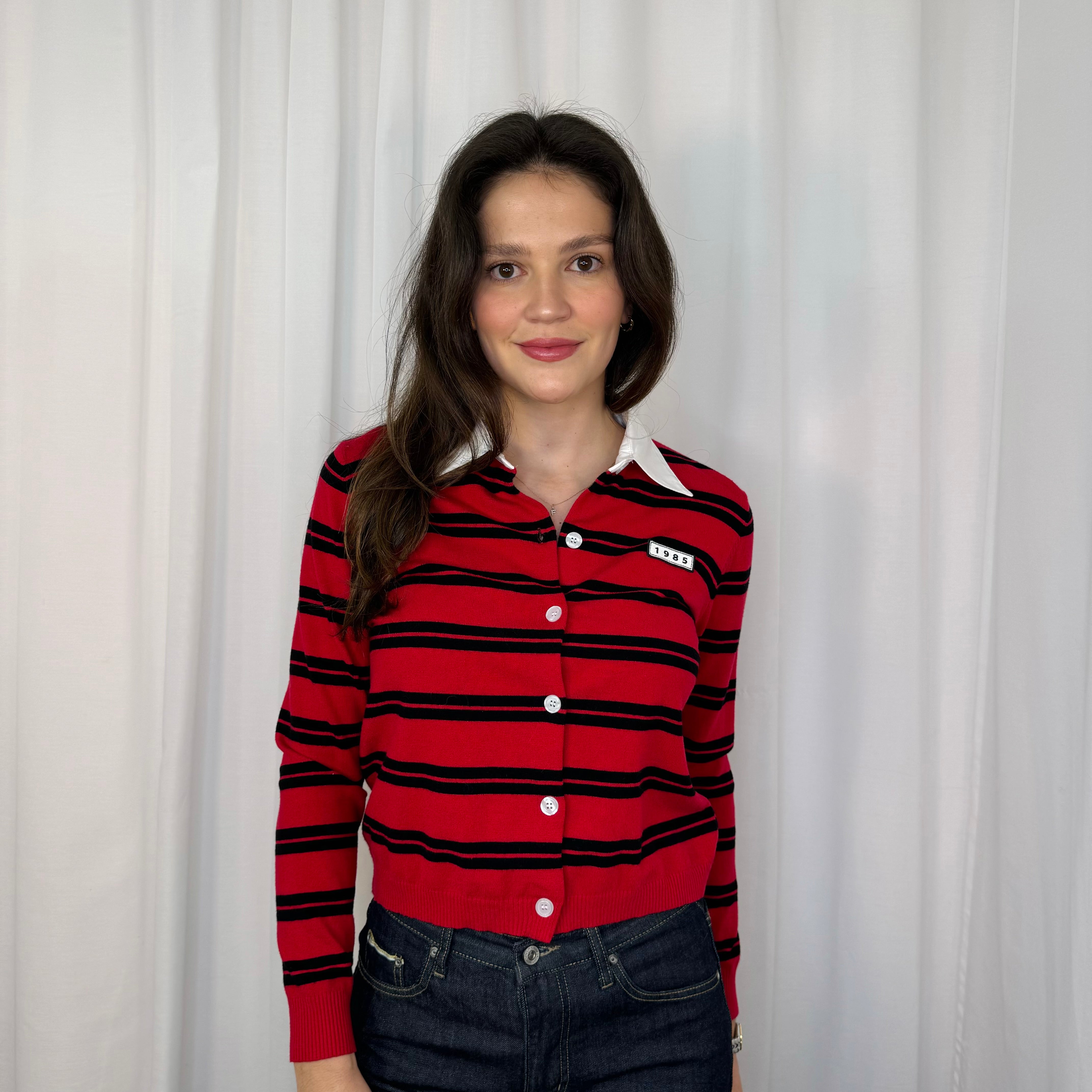 Camisola modelo polo. Golas em aba. Botões ao centro. Bordado ao peito. Riscas vermelho e preto.