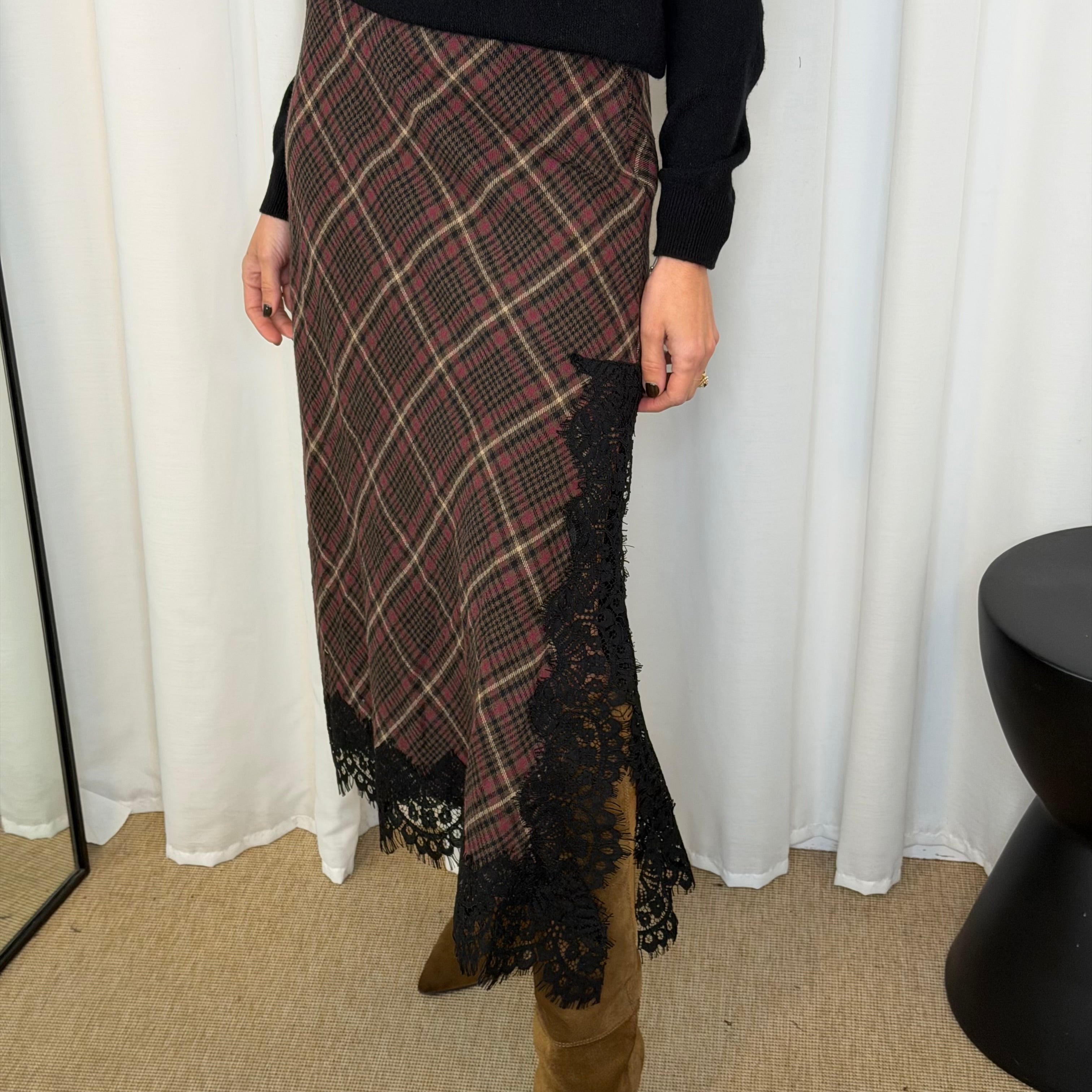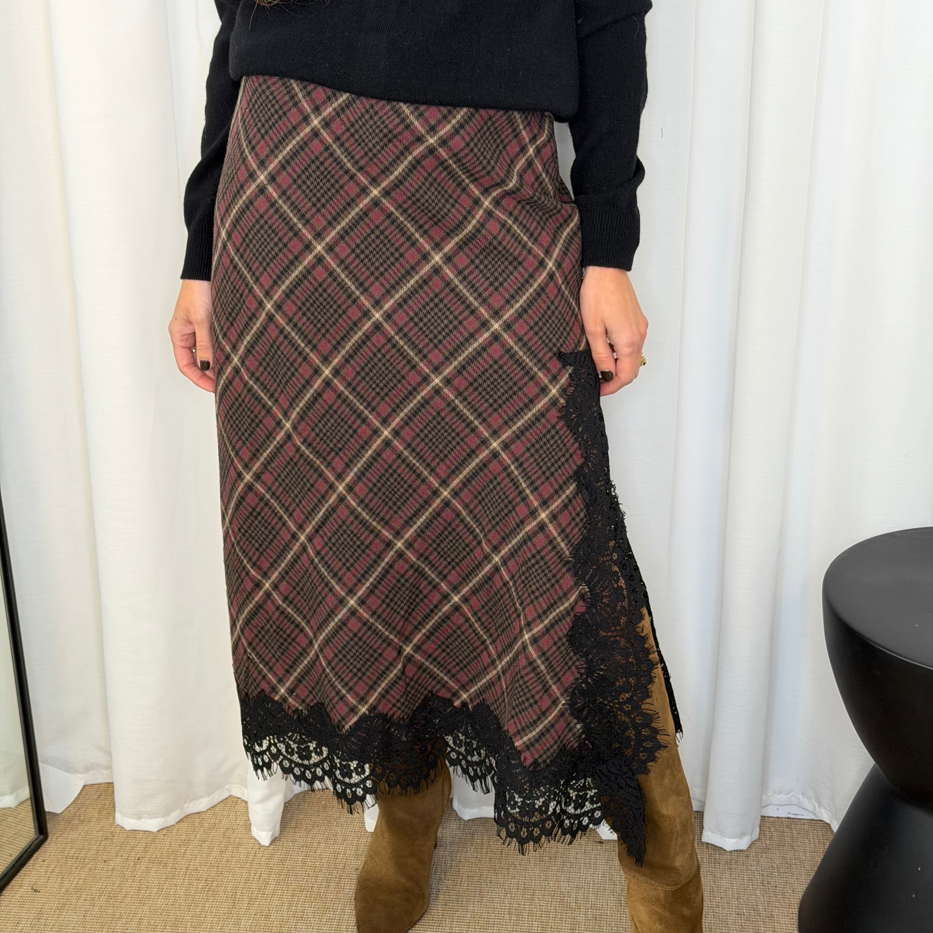 Saia comprimento midi em escocês em várias tonalidades de cinza, cru, preto, castanho e bordeaux e rosa. Racha e bainha em renda preta. Elástico na cintura.