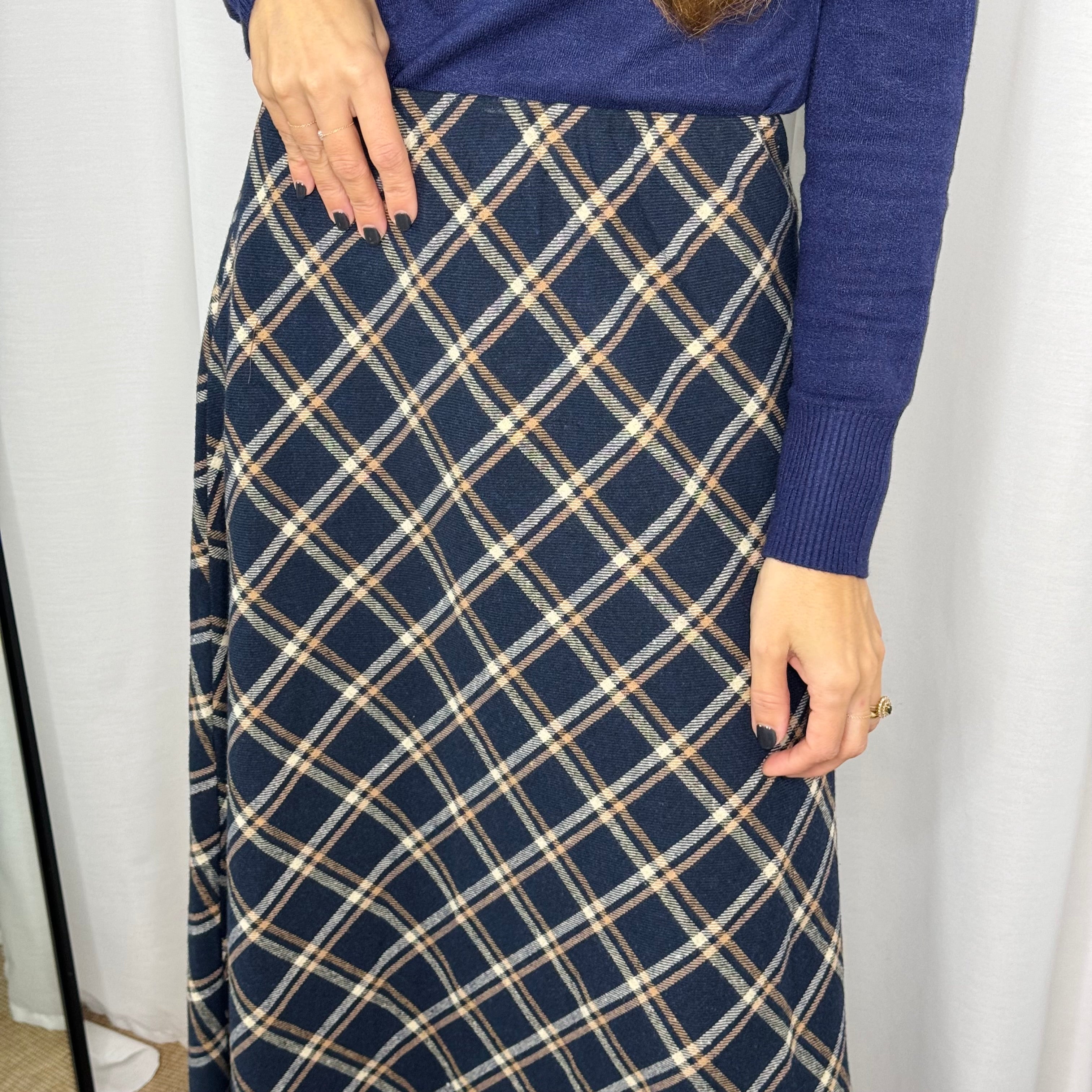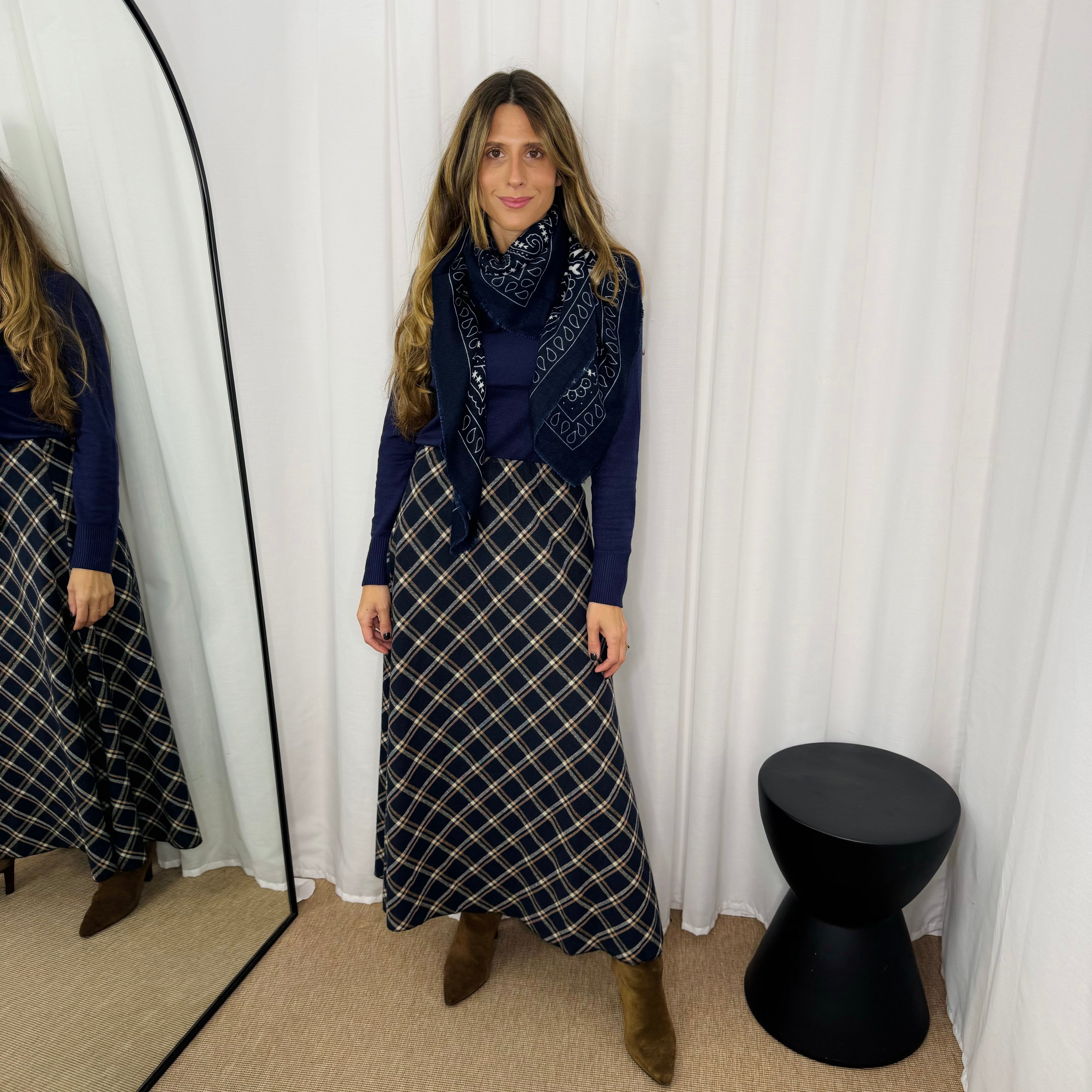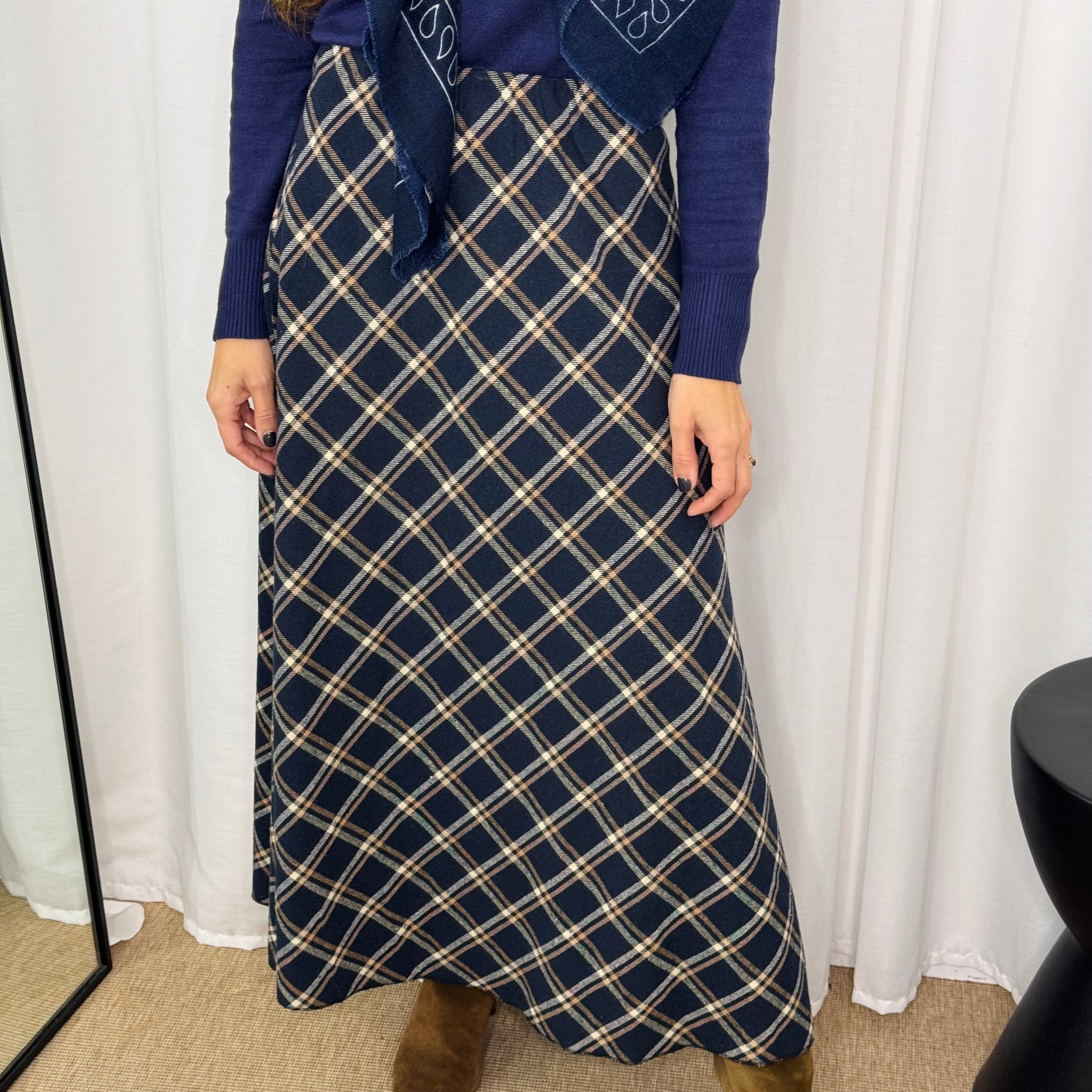 Saia escocês. Fundo azul marinho com estampado escocês. Elástico na cintura.