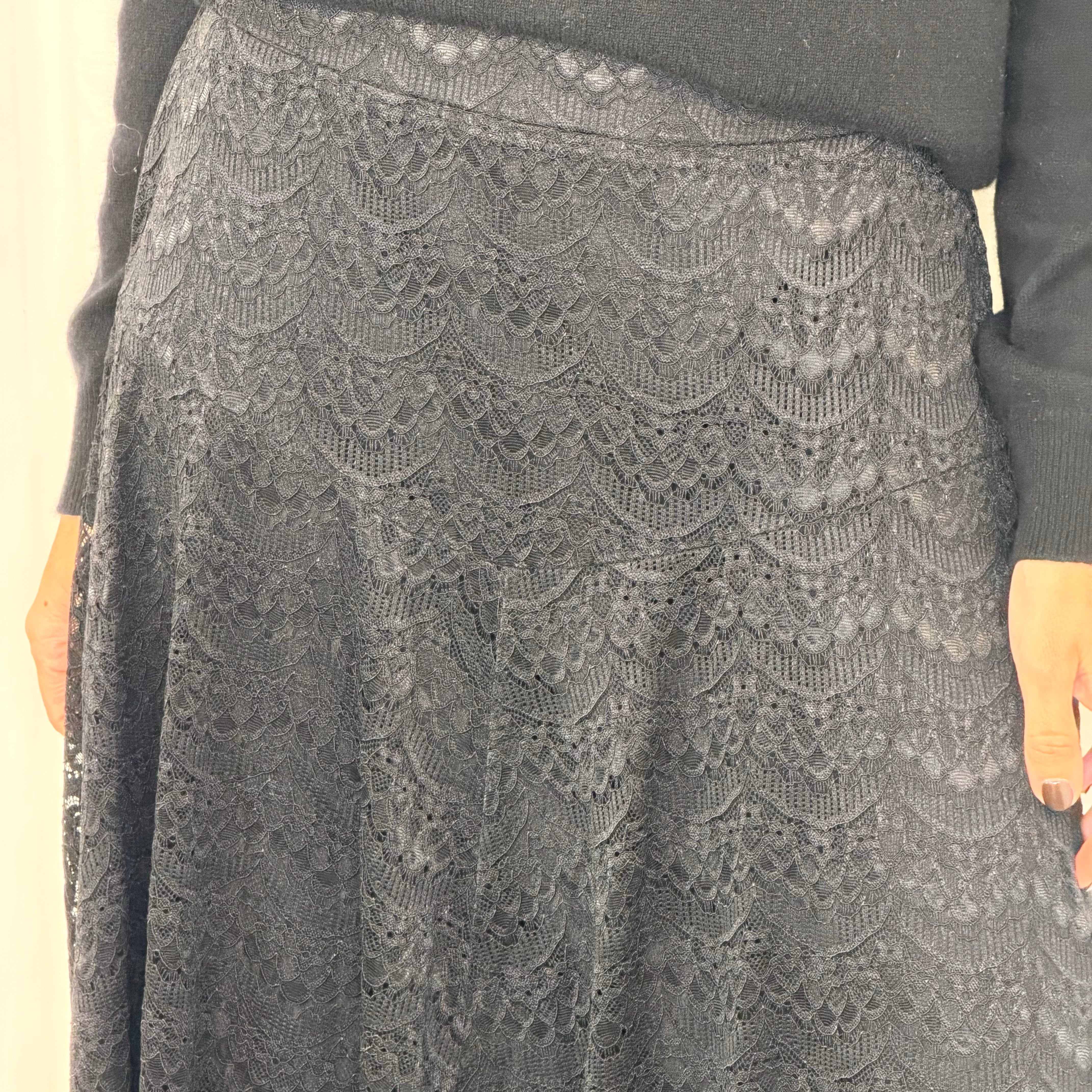 Saia comprimento midi. Elástico na cintura. Renda com forro incluido.