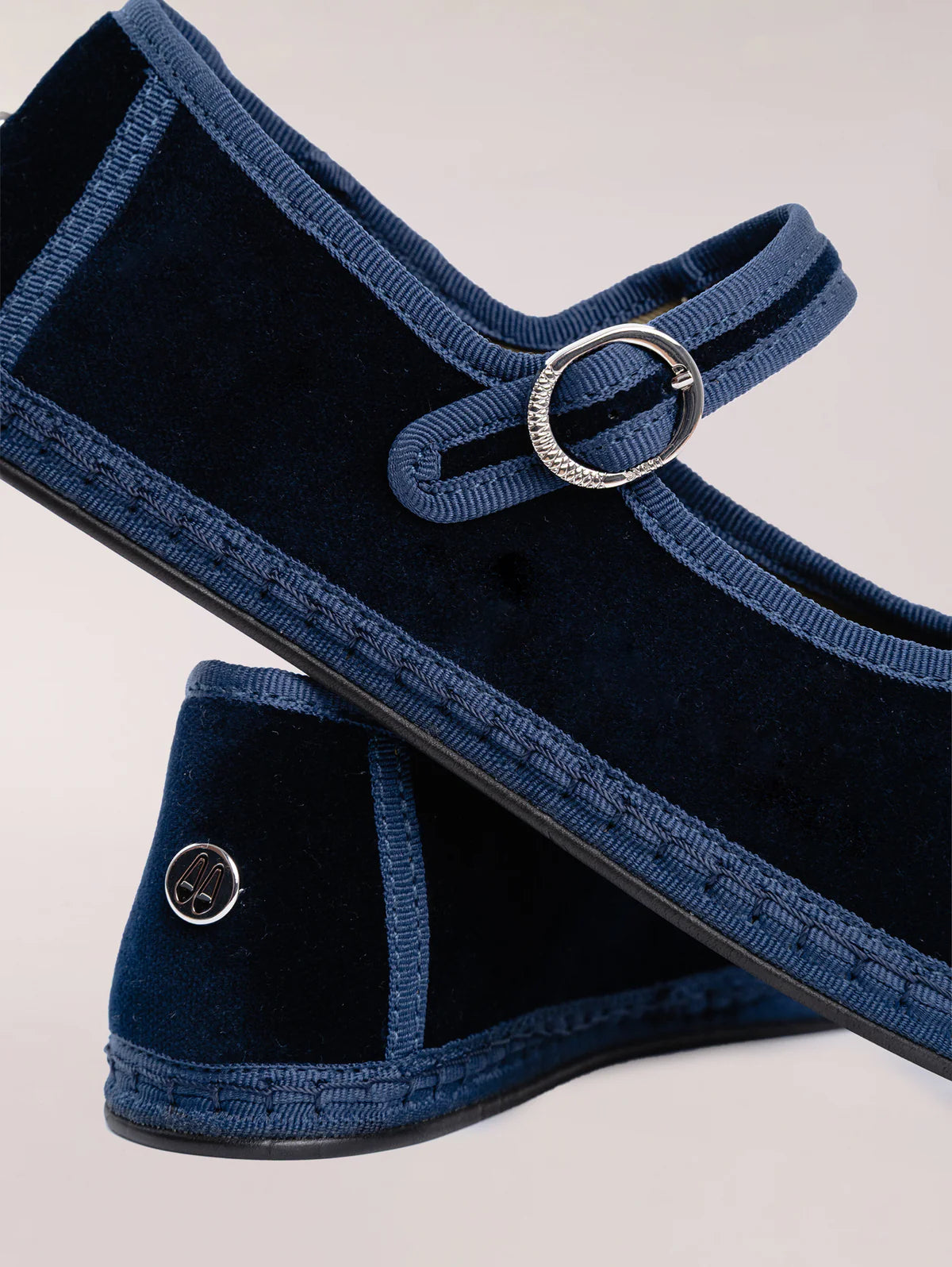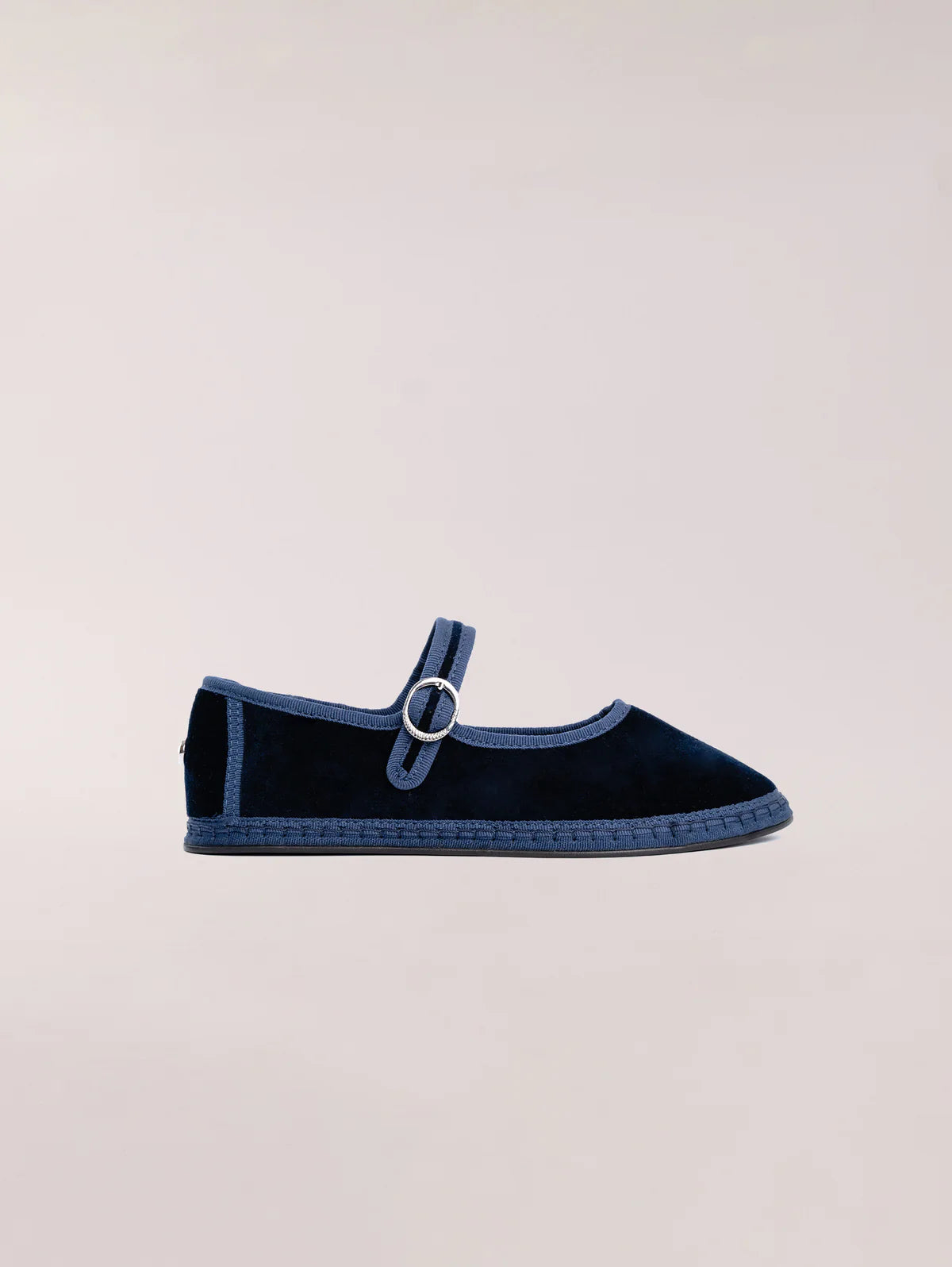 Sabrinas em veludo. Ajusta na fivela. Aperta com mola. Sola maleável. Feito à mão.