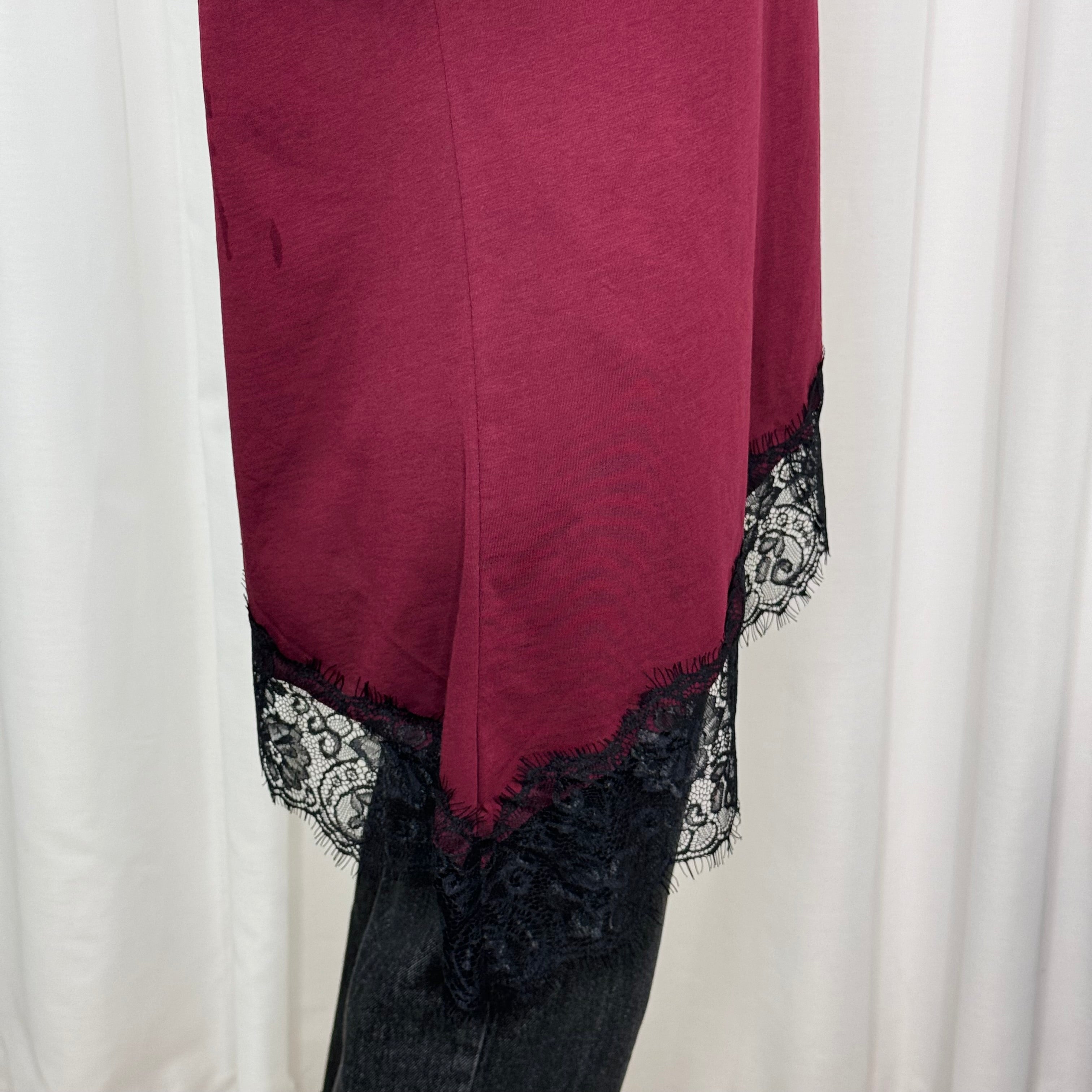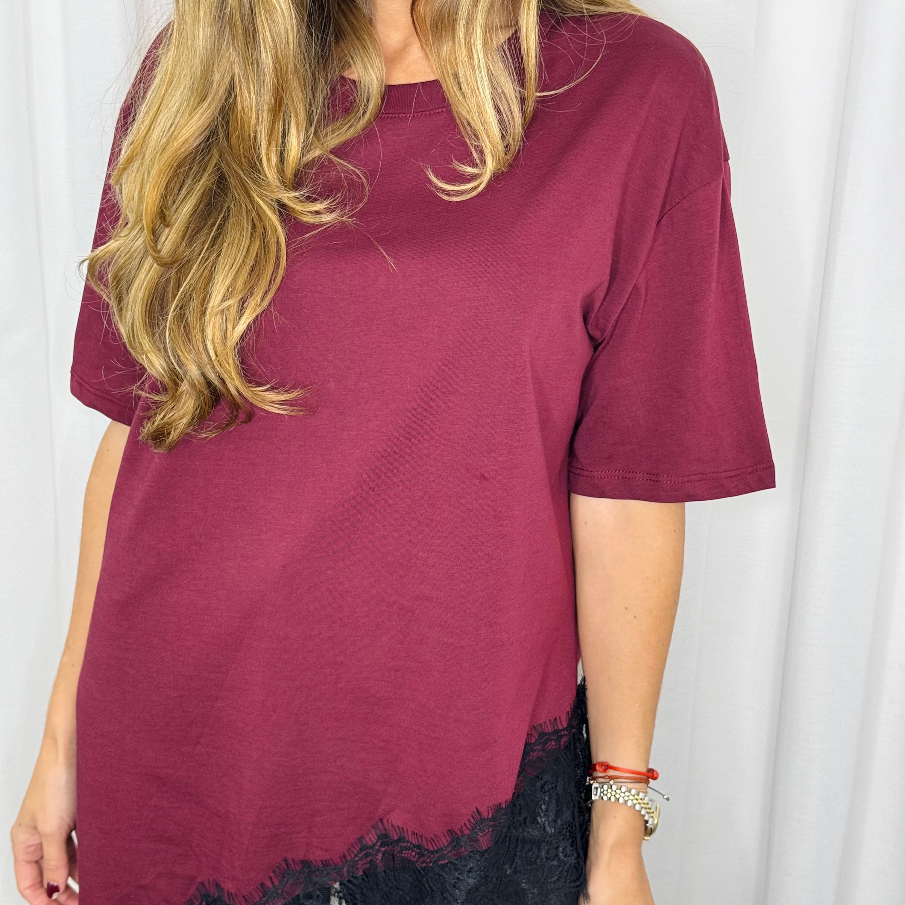 T-SHIRT ASSIMÉTRICA BORDEAUX COM RENDA