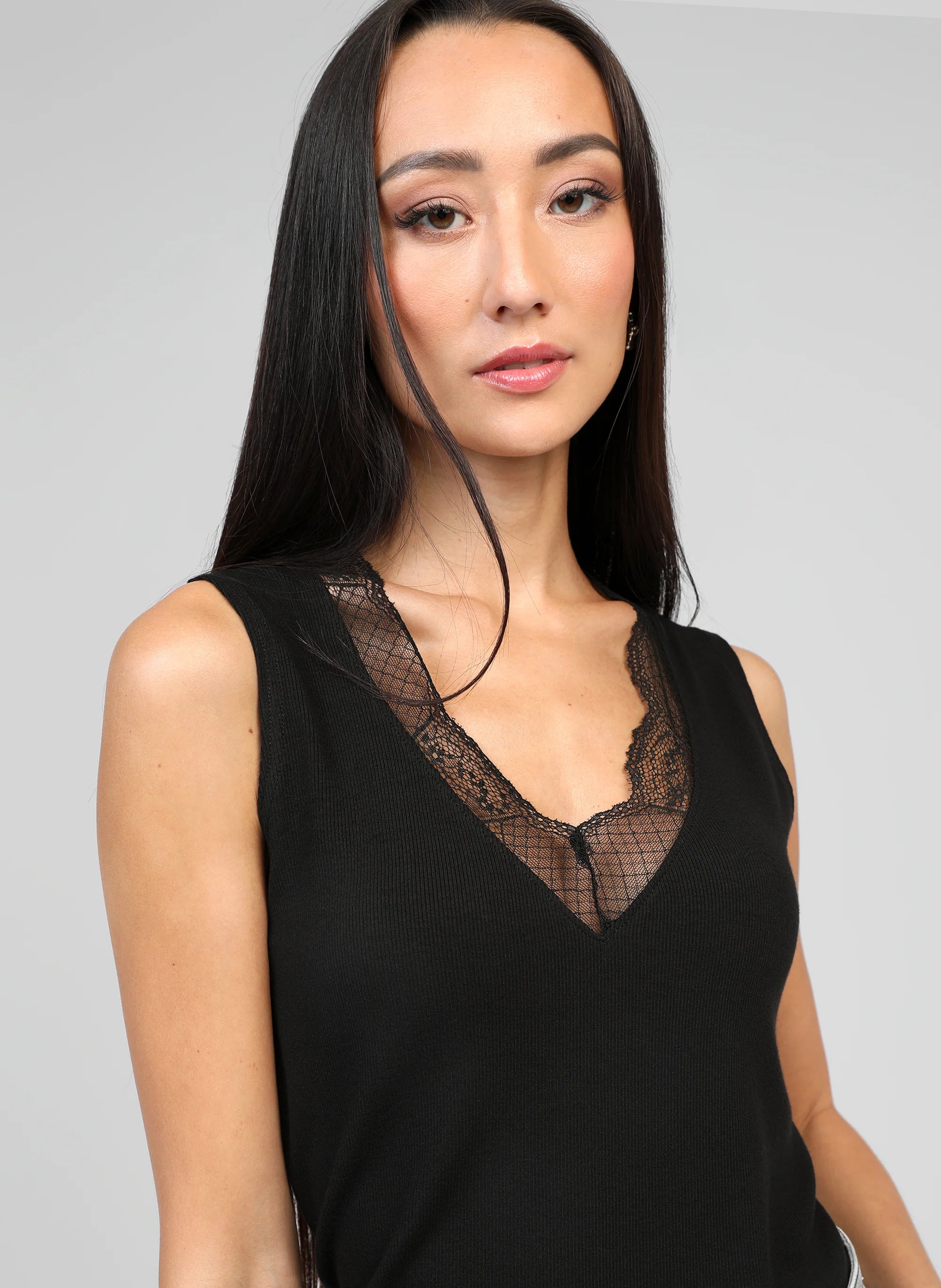 Top malha canelada. Mangas cavas e decote em bico. Decote com renda.
