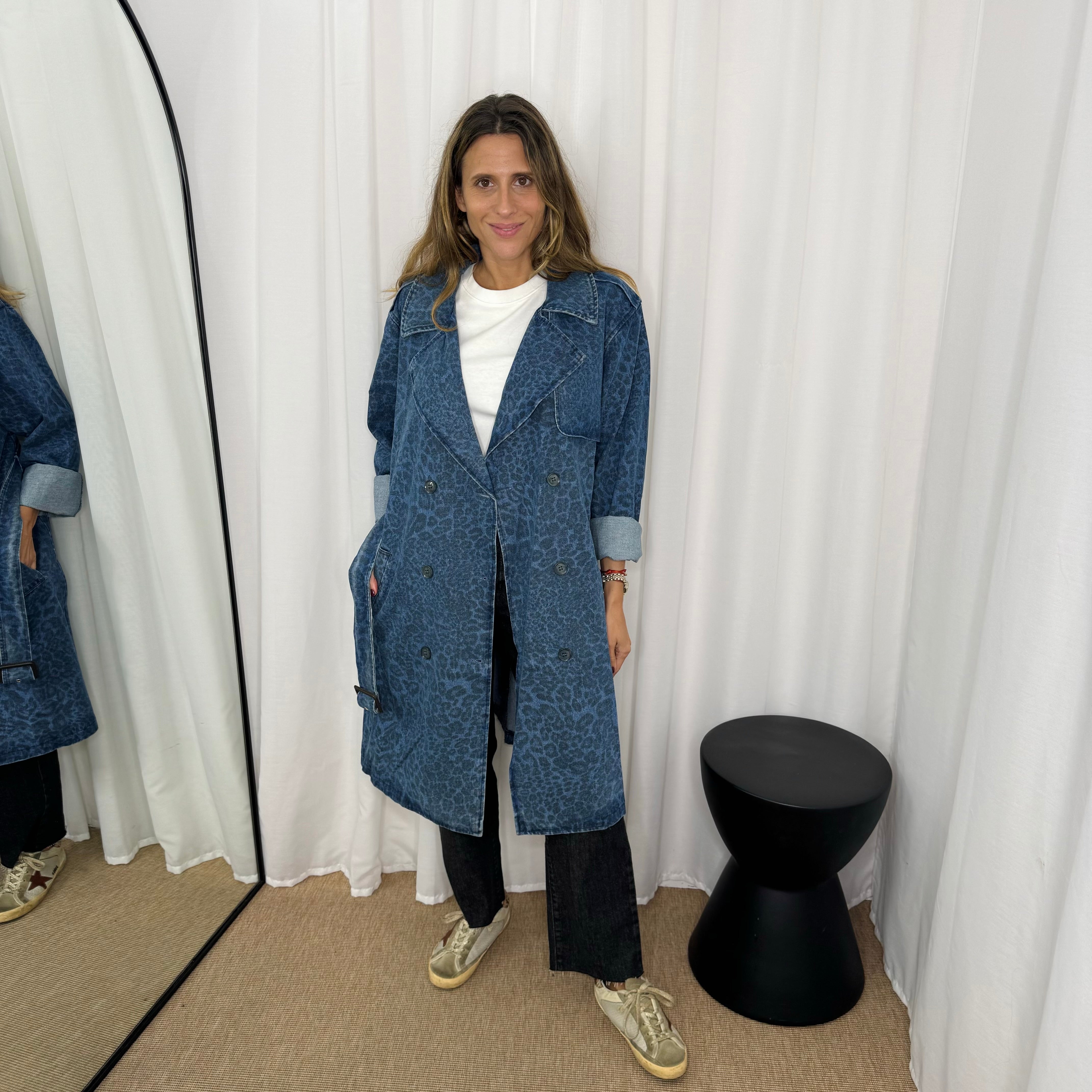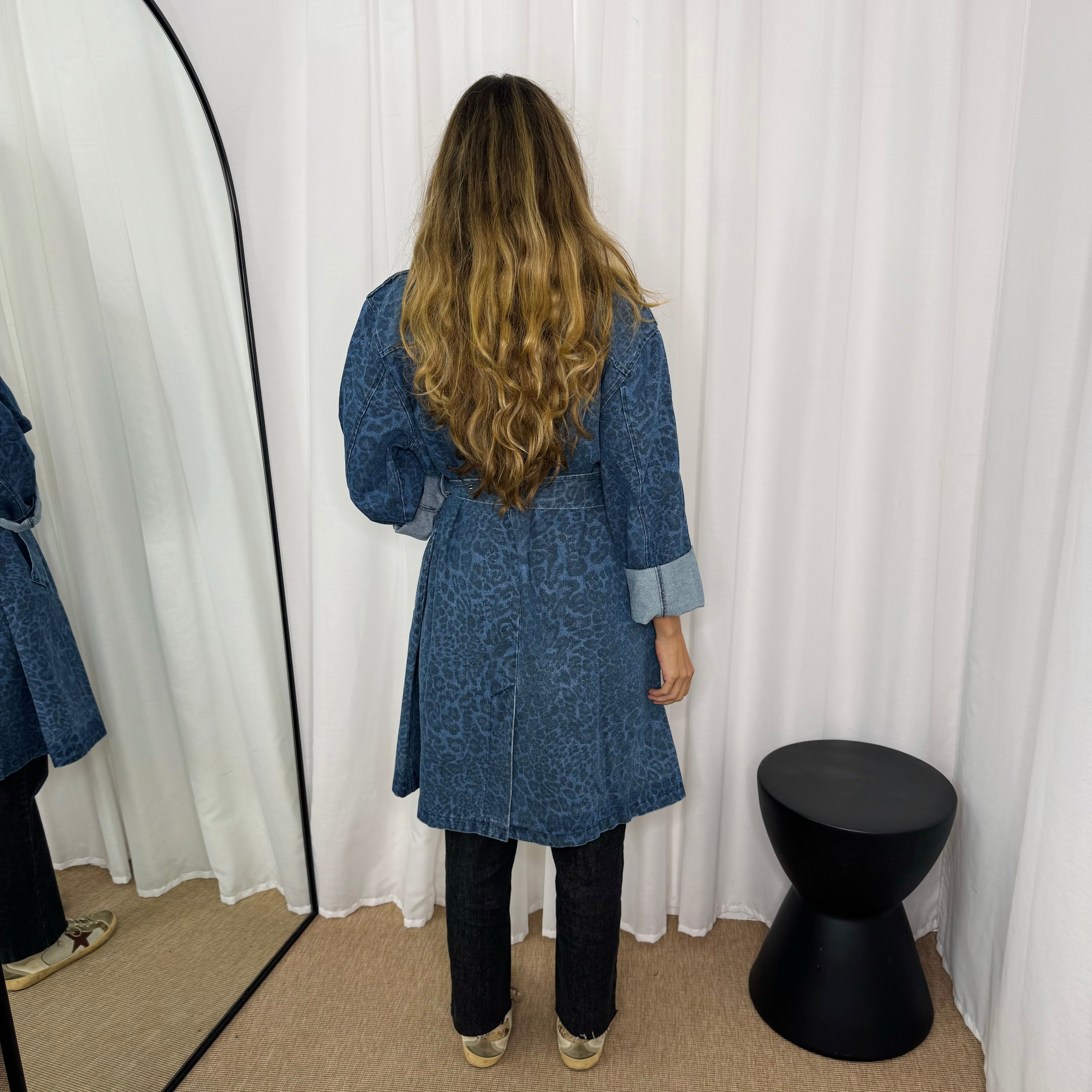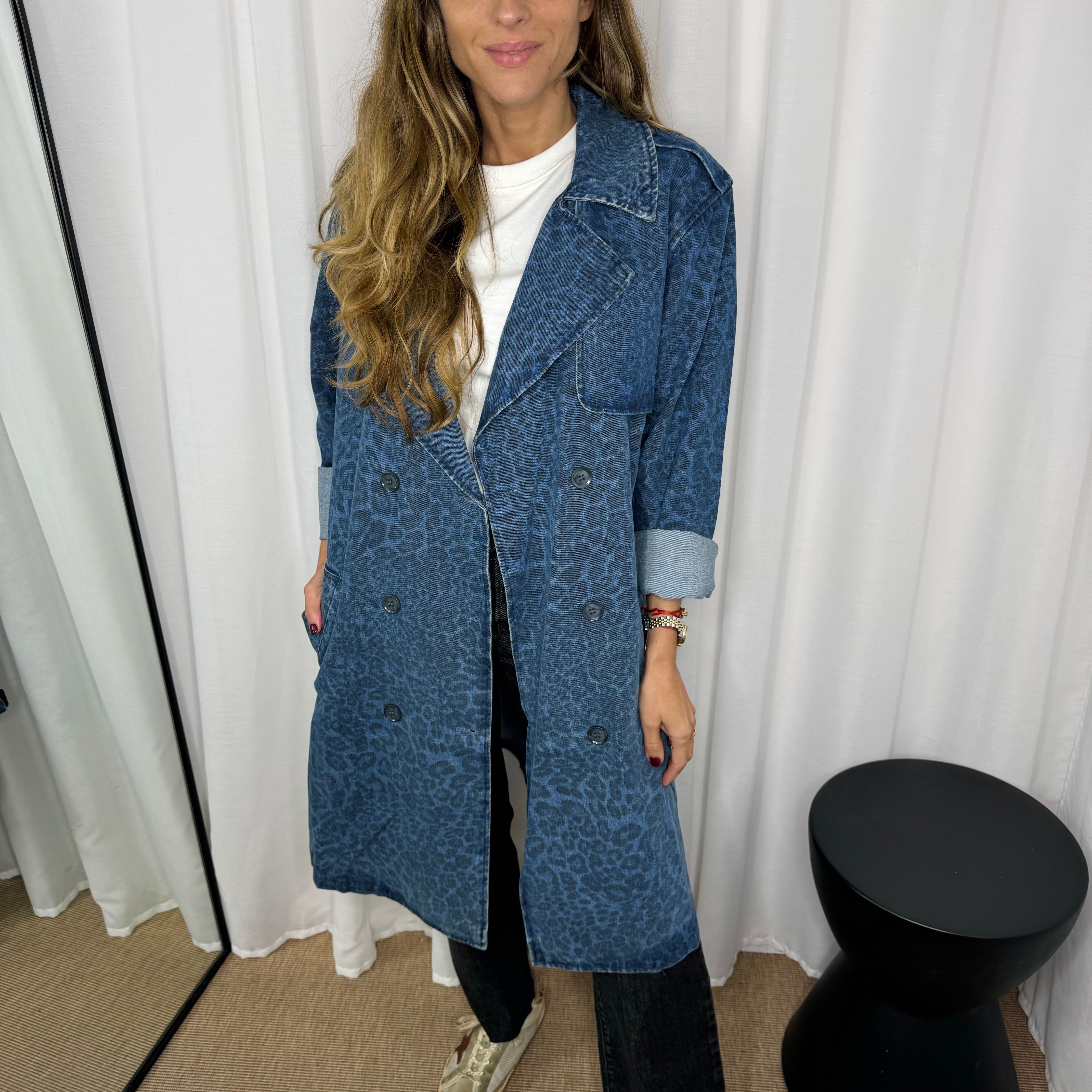 Casaco modelo Trench Coat fundo azul jeans estampado animal print. Aperta com botões e cinto com fivela. Bolsos laterais. Racha atrás.