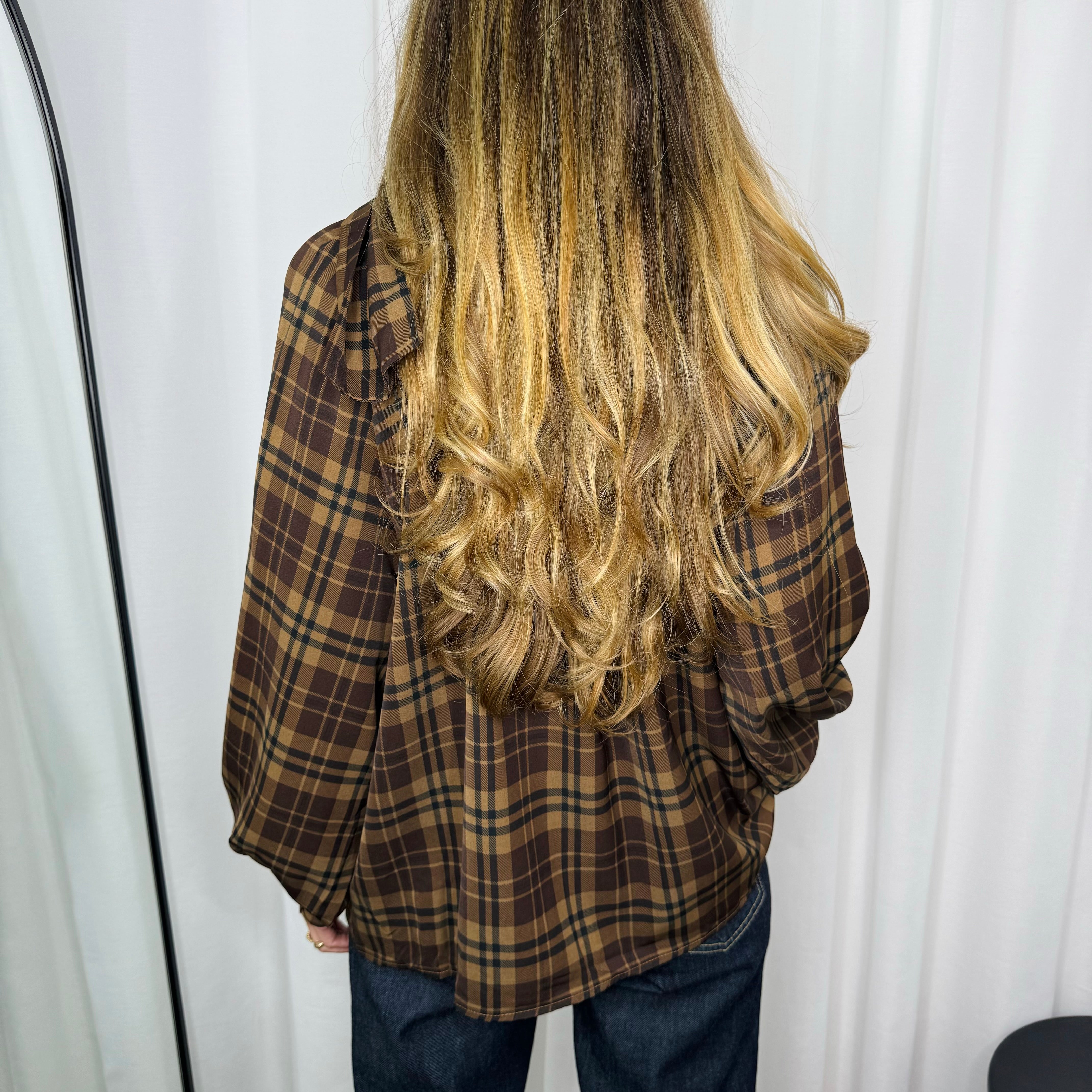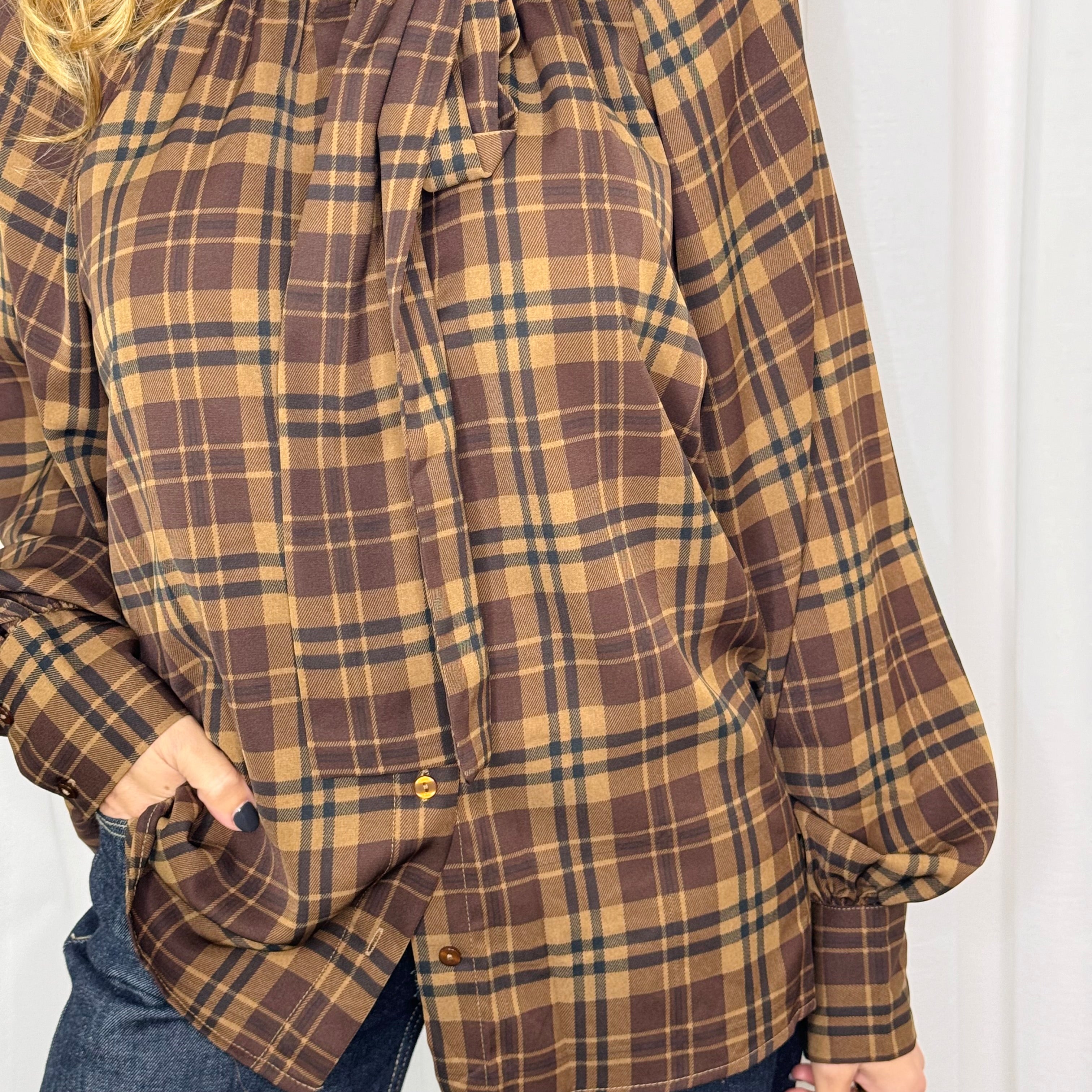 Camisa castanha com estampado escocês. Mangas abalonadas. Laçada no pescoço. Aperta com botões ao centro.