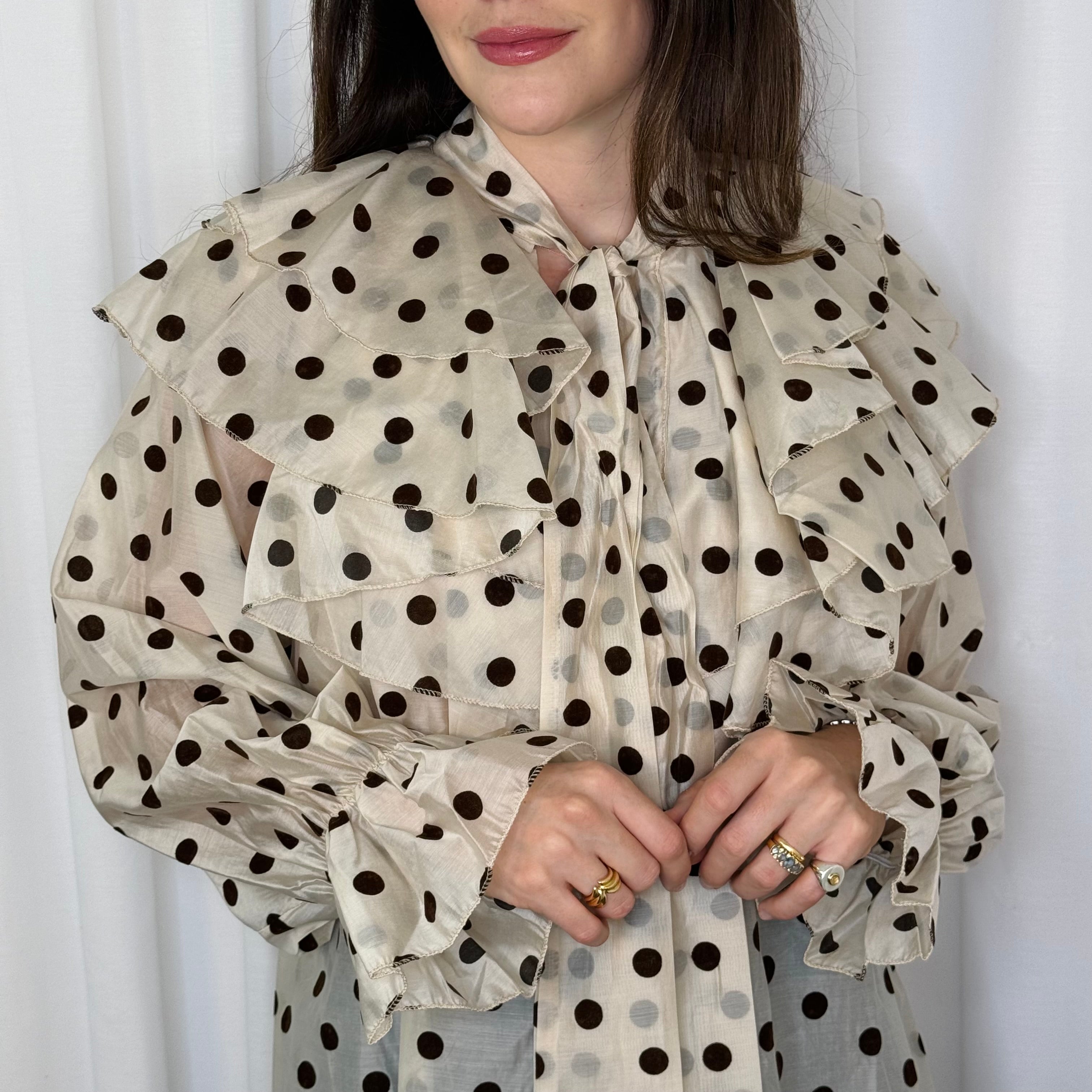 Camisa fluida com folhos. Fundo cru com bolas castanhas. Aperta com botões ao centro e laçada ao pescoço.