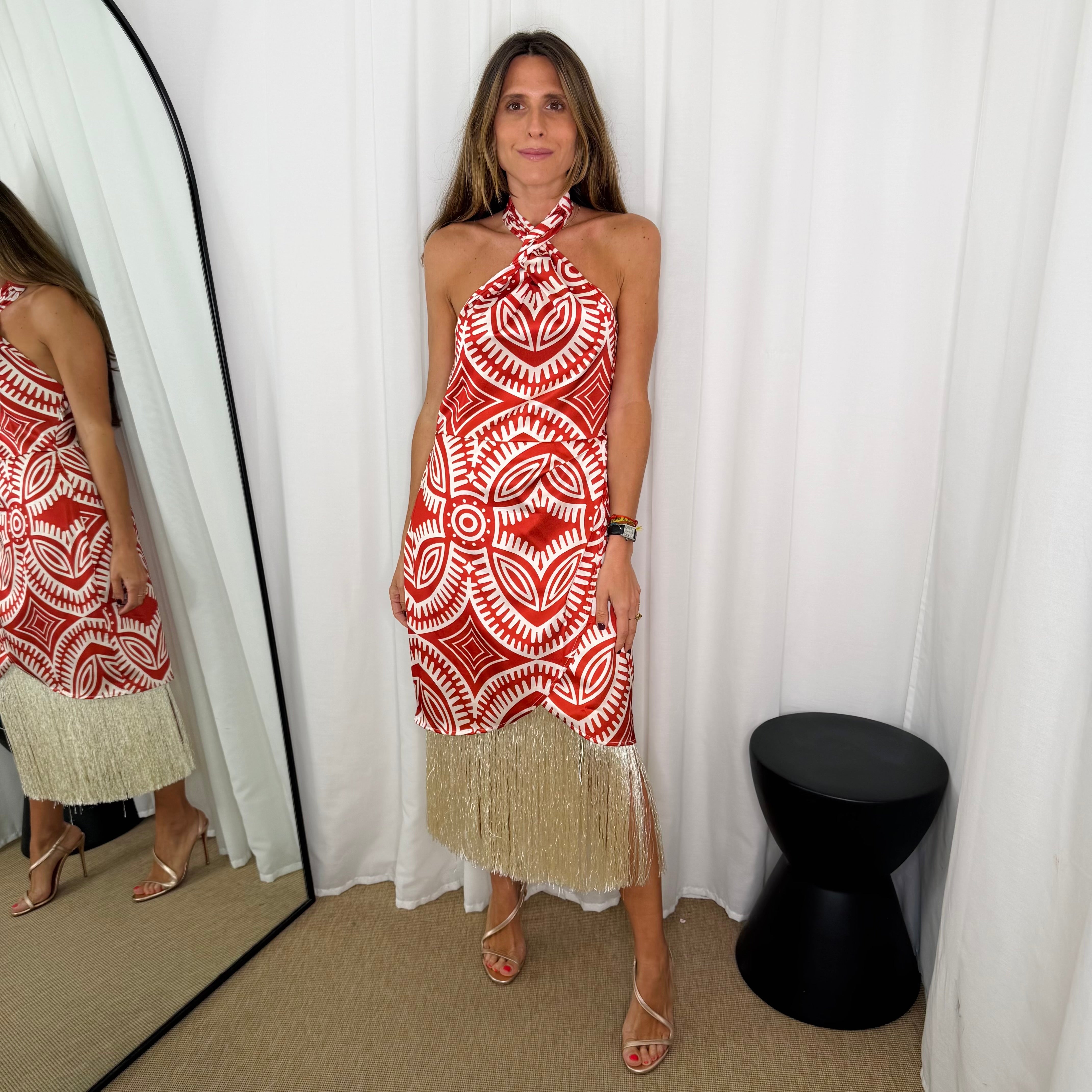 Vestido fluido. Decote halter. Fundo terracota com estampado geométrico cru. Elástico nas costas. Acabamento em franjas.
