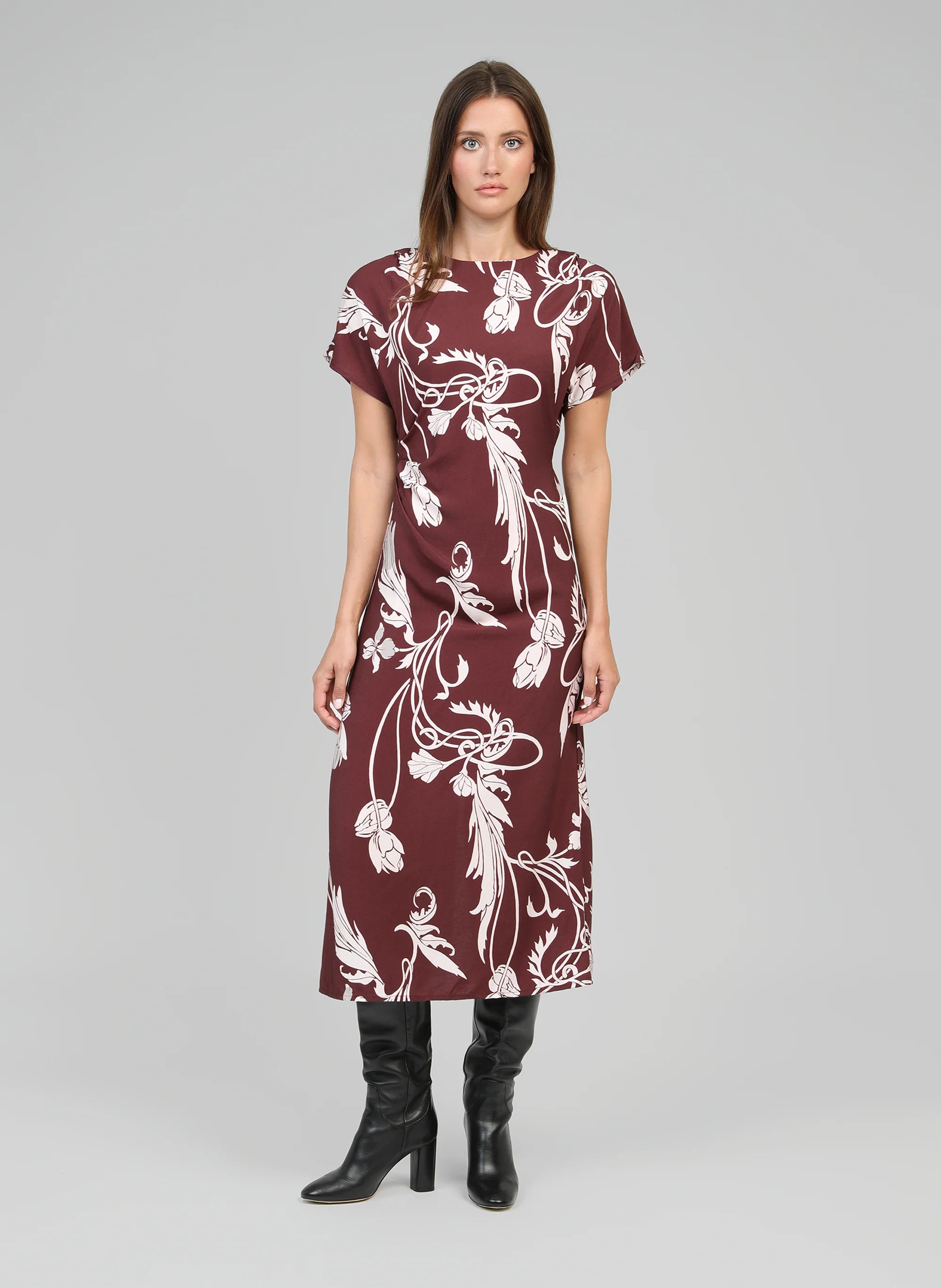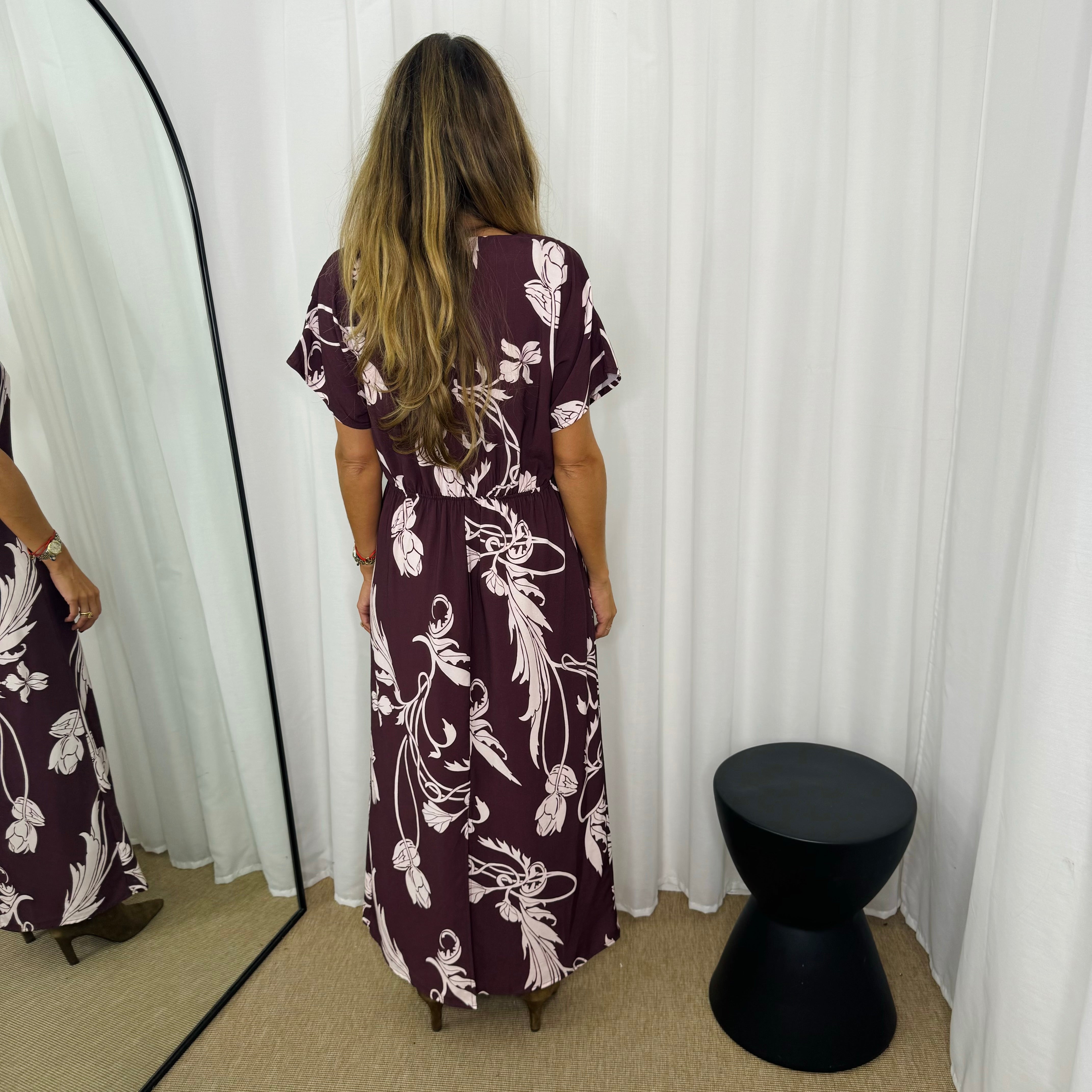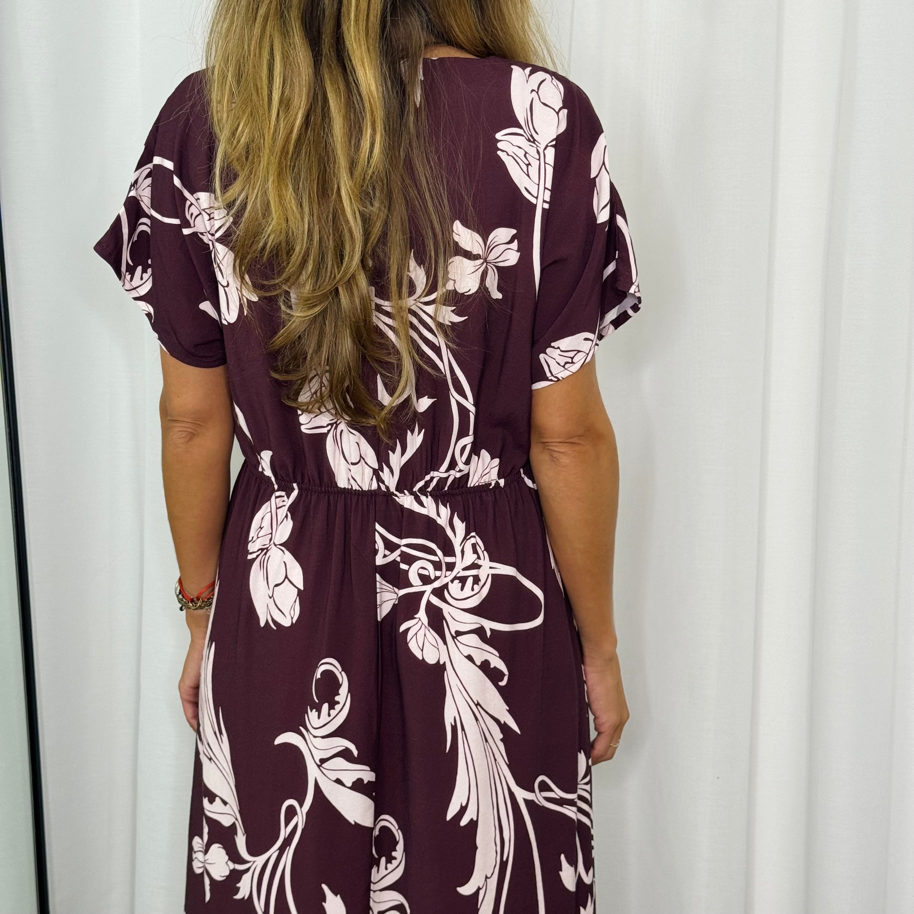 Vestido comprimento midi. Mangas curtas e decote redondo. Fundo bordeaux com estampado floral em cru.