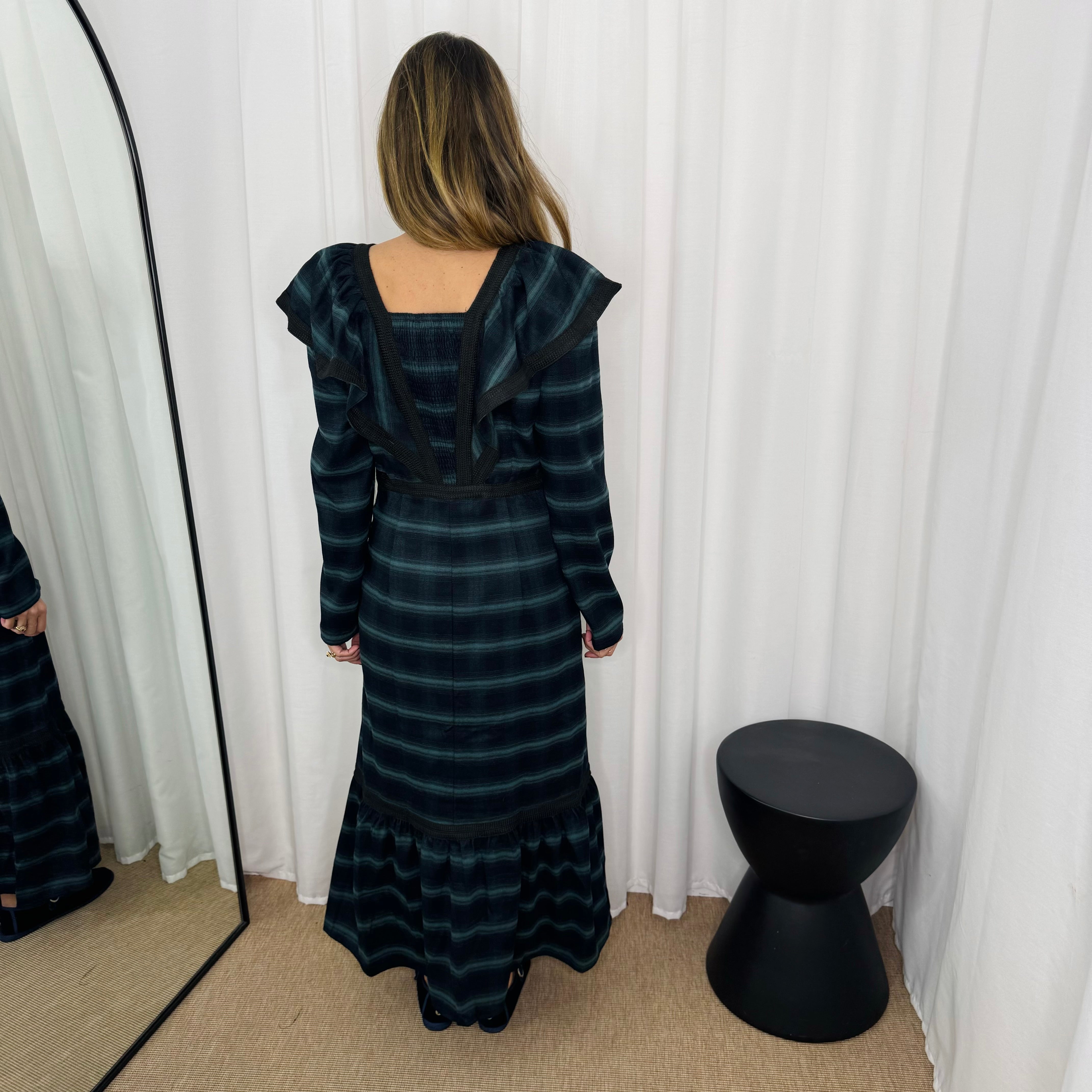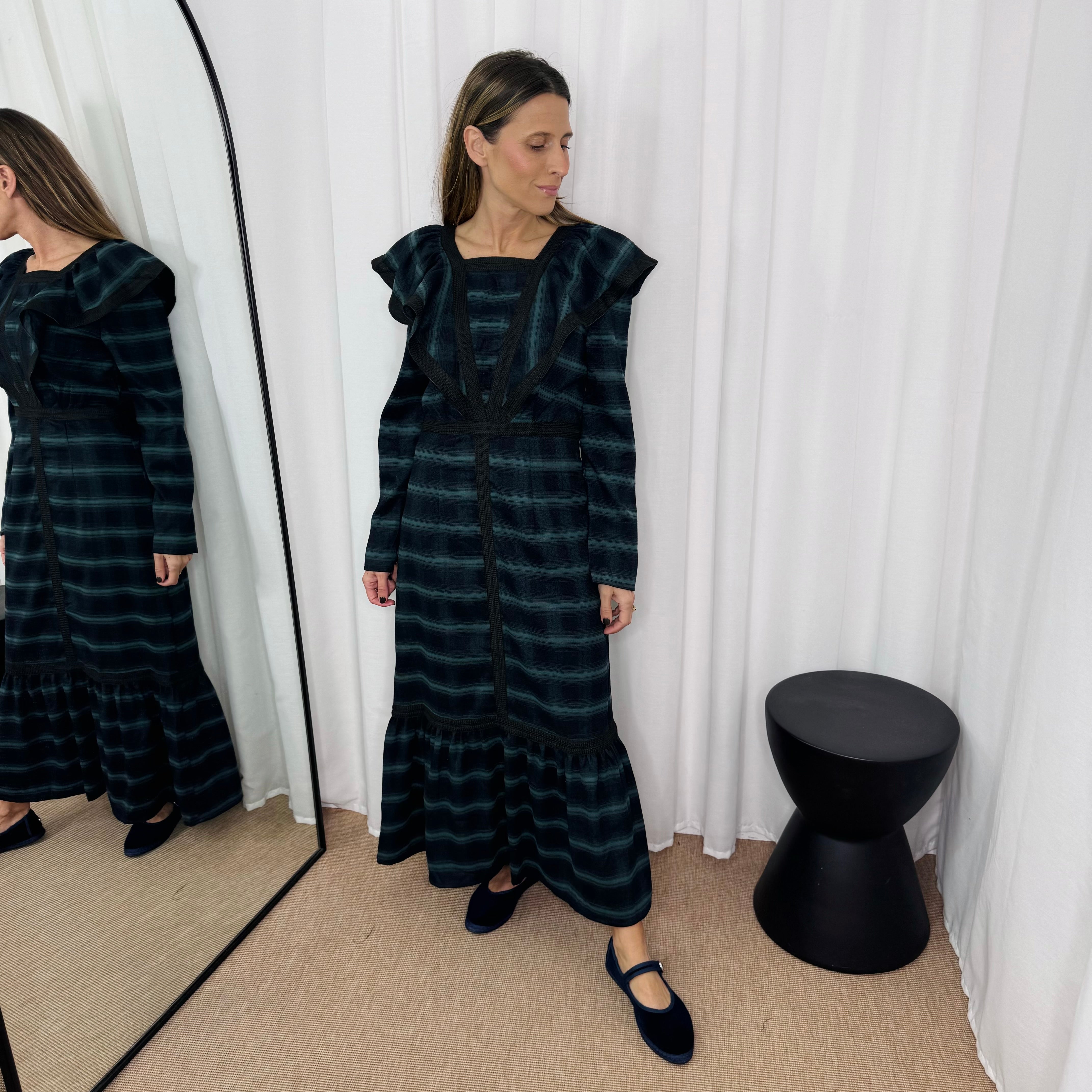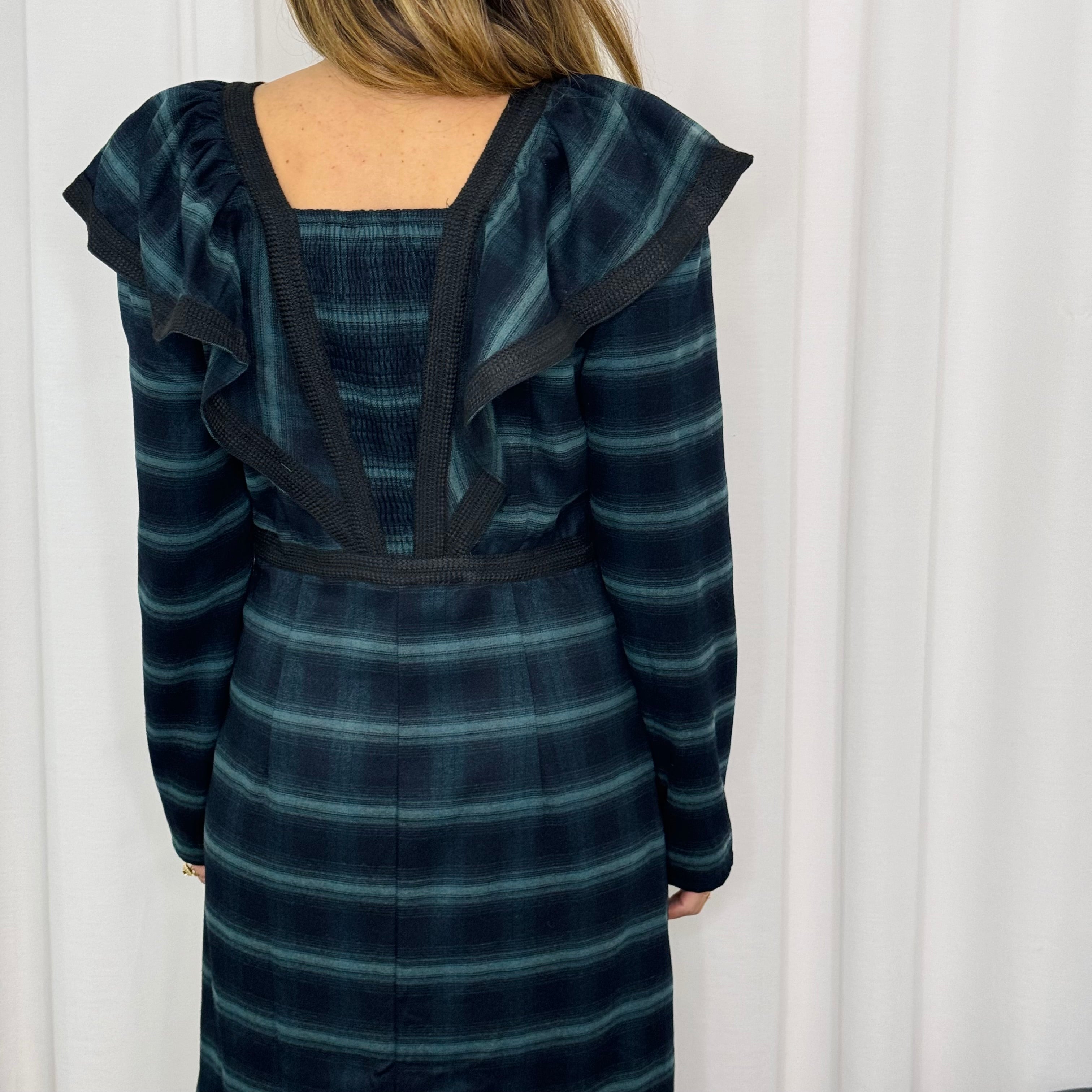 Vestido comprido estampado. Acabamento em folho na bainha e os ombros. Aperta com fecho invisível lateral.