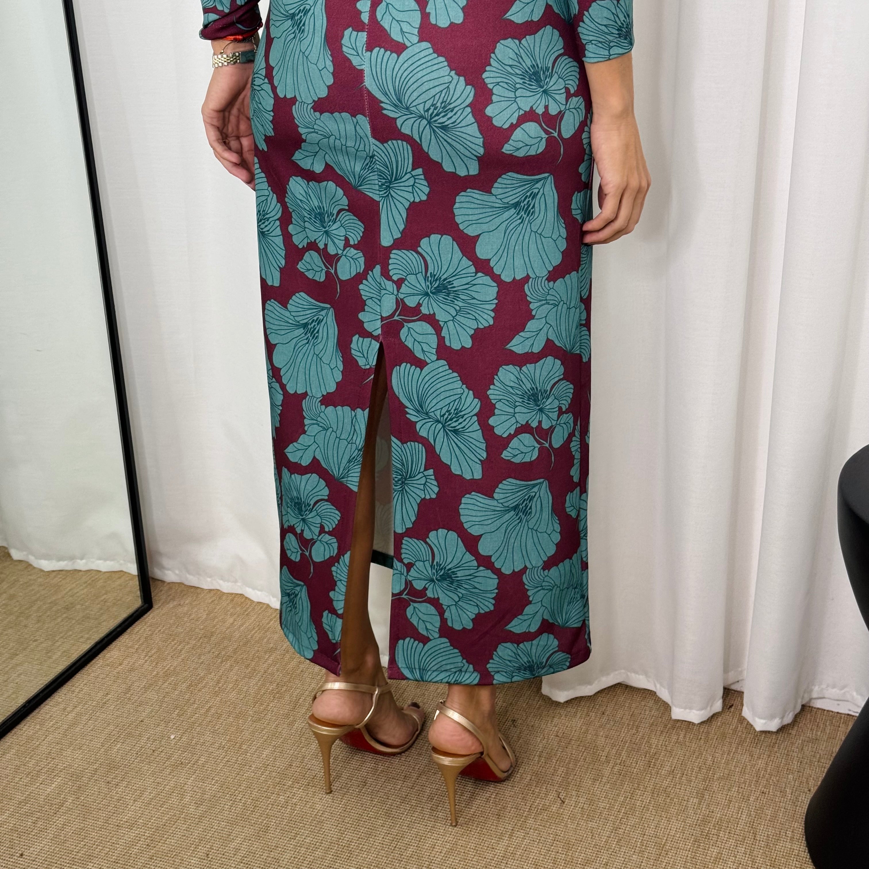 Vestido comprimento midi. Fundo bordeaux com estampado floral azul turquesa. Decote redondo. Mangas compridas. Pormenor de volume nos ombros. Racha atrás ao centro.