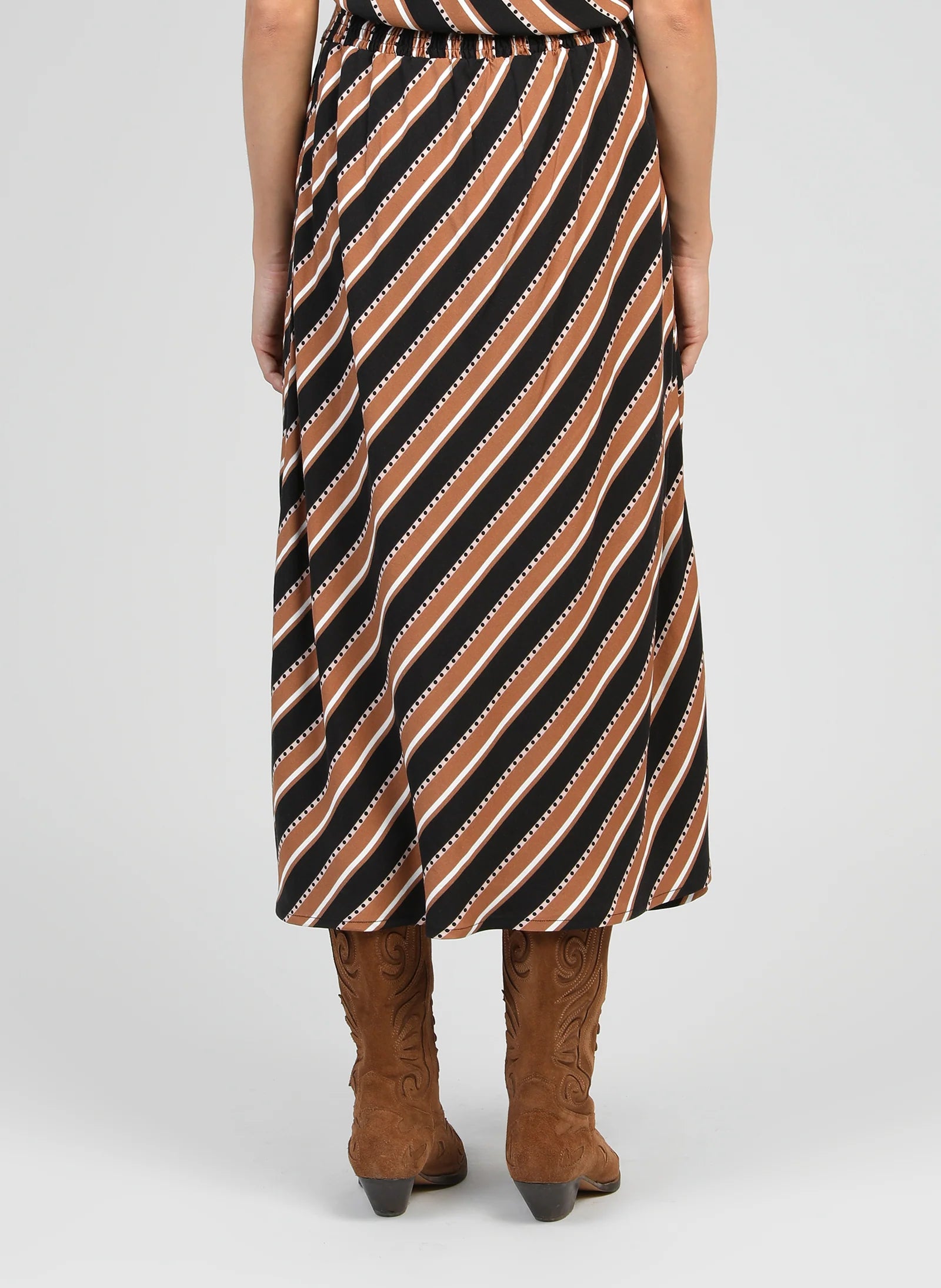 Saia fluida comprimento midi. Elástico na cintura atrás.