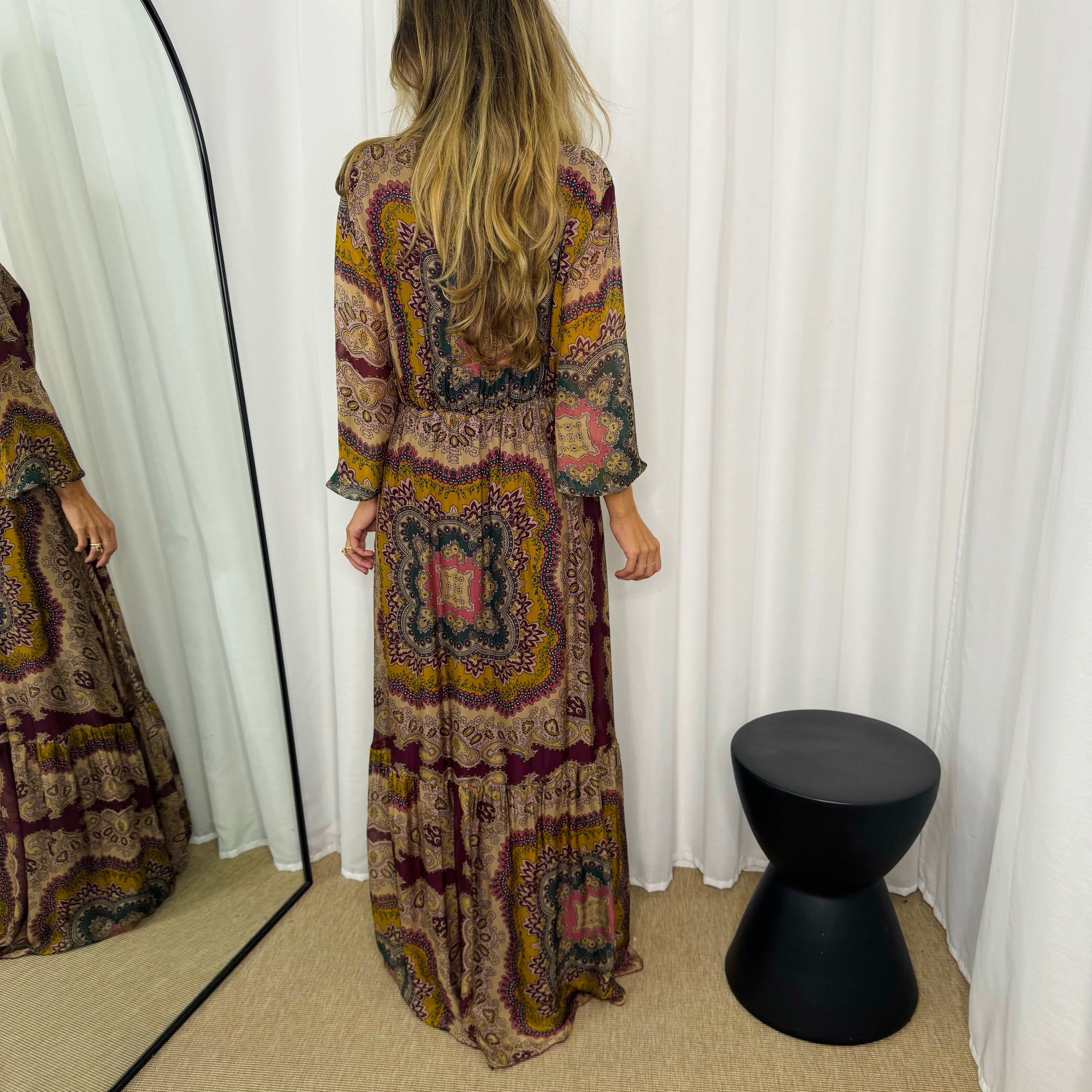 Vestido fluido comprido. Tecido confortável. Decote em bico. Mangas compridas. Elástico na cintura. Em tons de bordeaux, camel e mostarda.