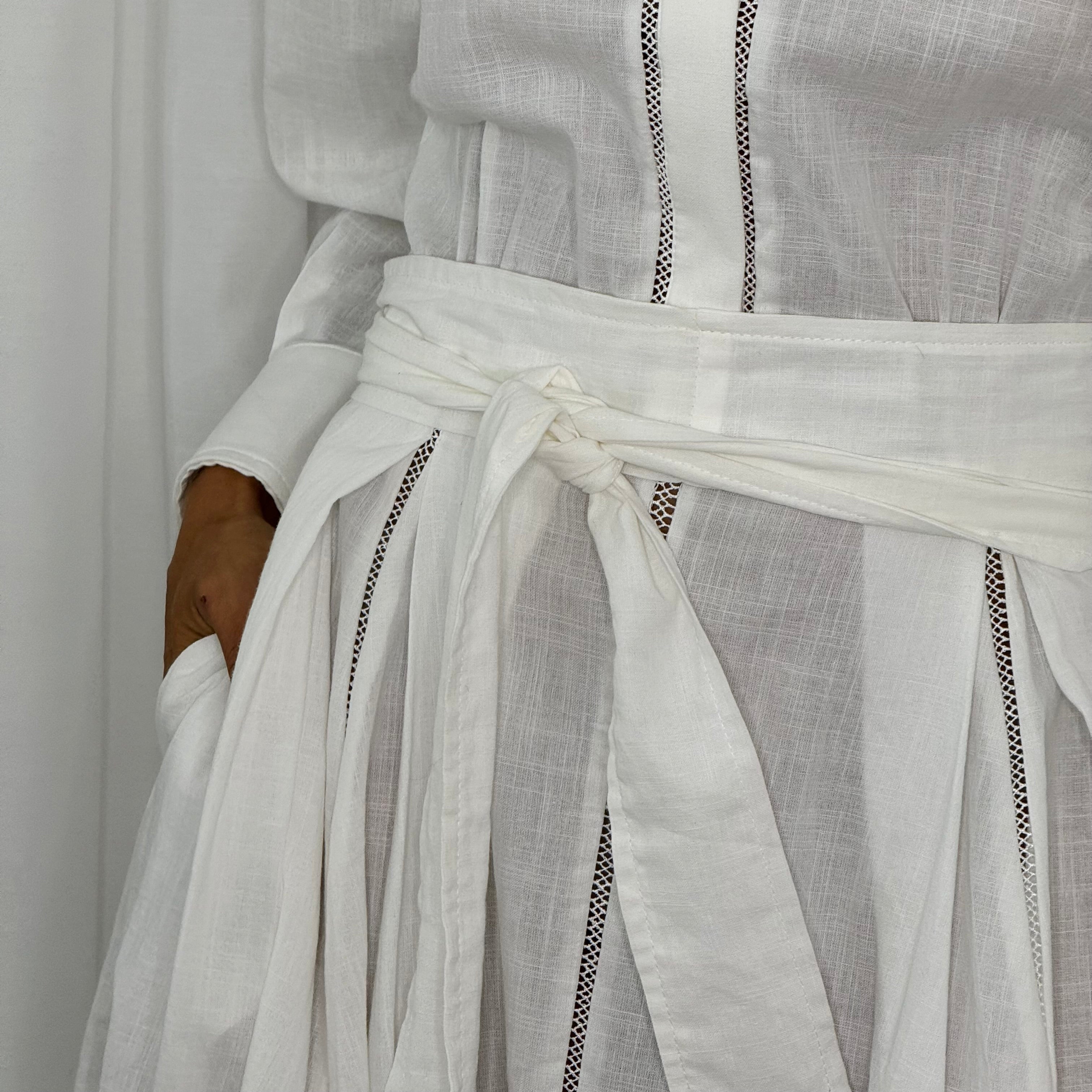 Vestido em linho branco. Fecho invisível lateral. Punho forrado com botão. Renda nas costas. Gola em aba. Aperta com botões no centro. Pormenor em renda no ombro e bainha.