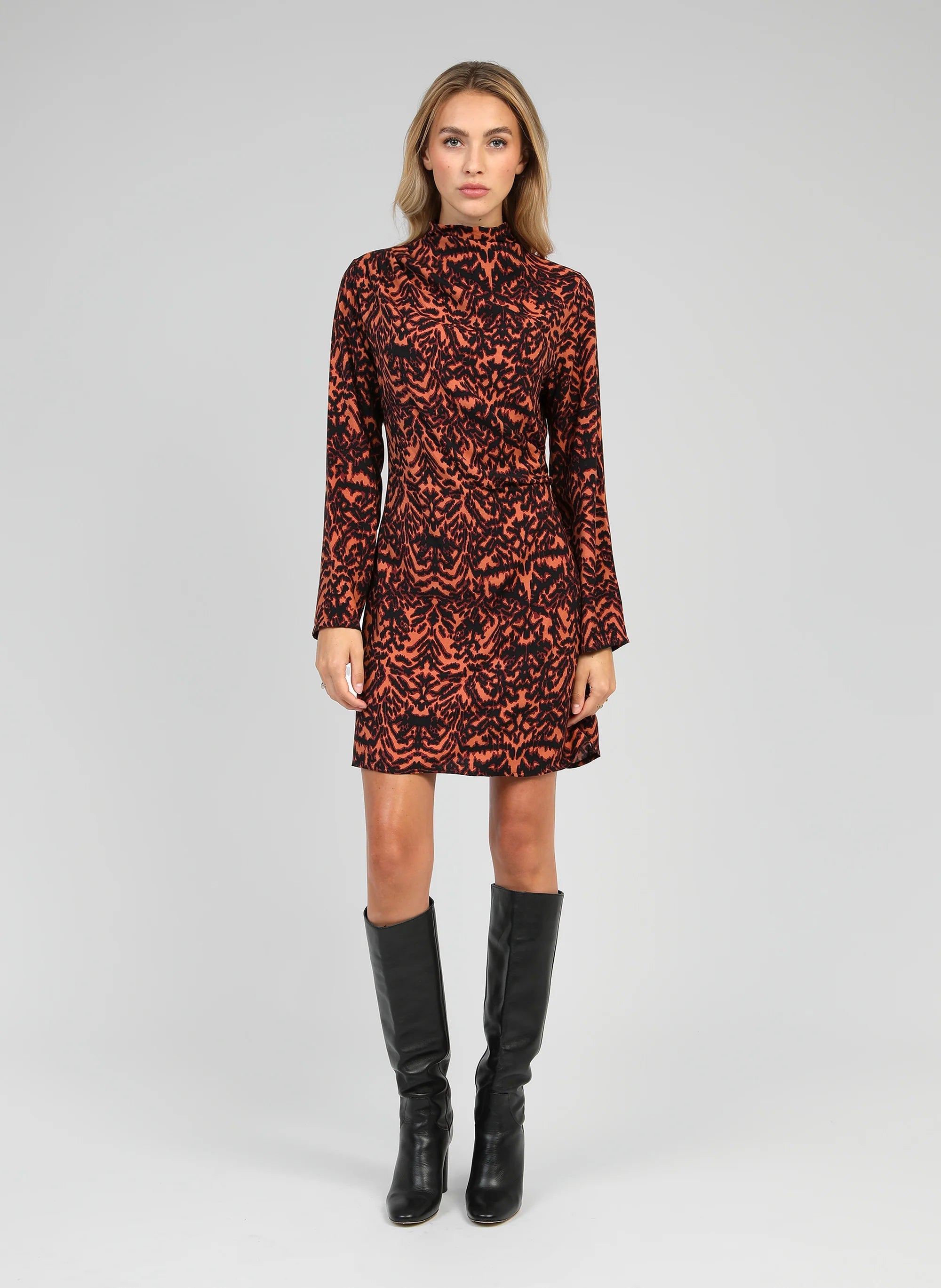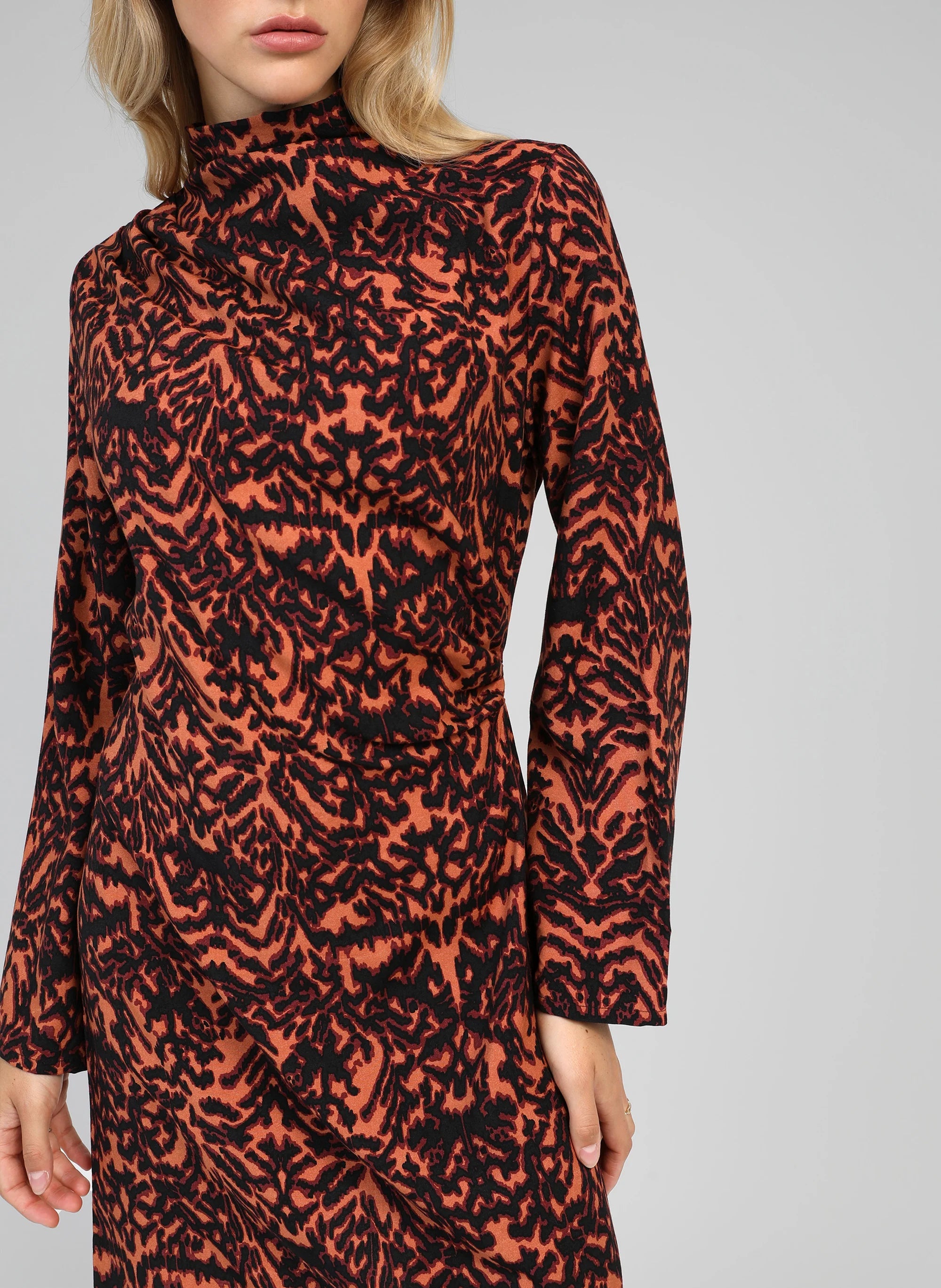 Vestido de manga comprida com padrão abstrato em tons de preto e laranja, corte direito e gola subida. Um modelo elegante e versátil, perfeito para usar do dia para a noite.
